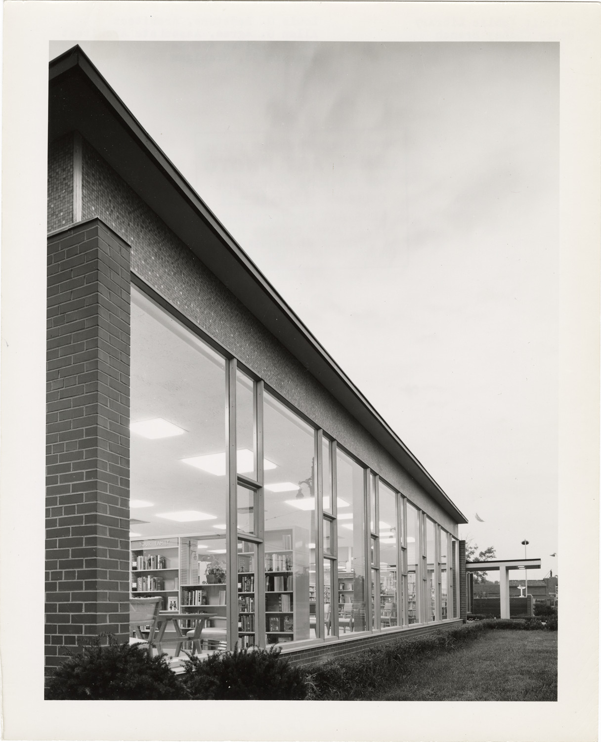View at an angle of windows on the Chaney Branch Library, Detroit Public Library. Stamped on back: "When published, please credit Lens-Art Photo. For duplicate photos give order no. 3260-3. Lens-Art Photographers, 15743 James Couzens Hwy. Detroit 21, Michigan. Phone: UN. 4-5134." Typed on back: "Detroit Public Library. Henry Chaney Branch. Louis G. Redstone, architect. Allan G. Agree, associate architect. 10811 Puritan Avenue, Detroit 38, Michigan."
