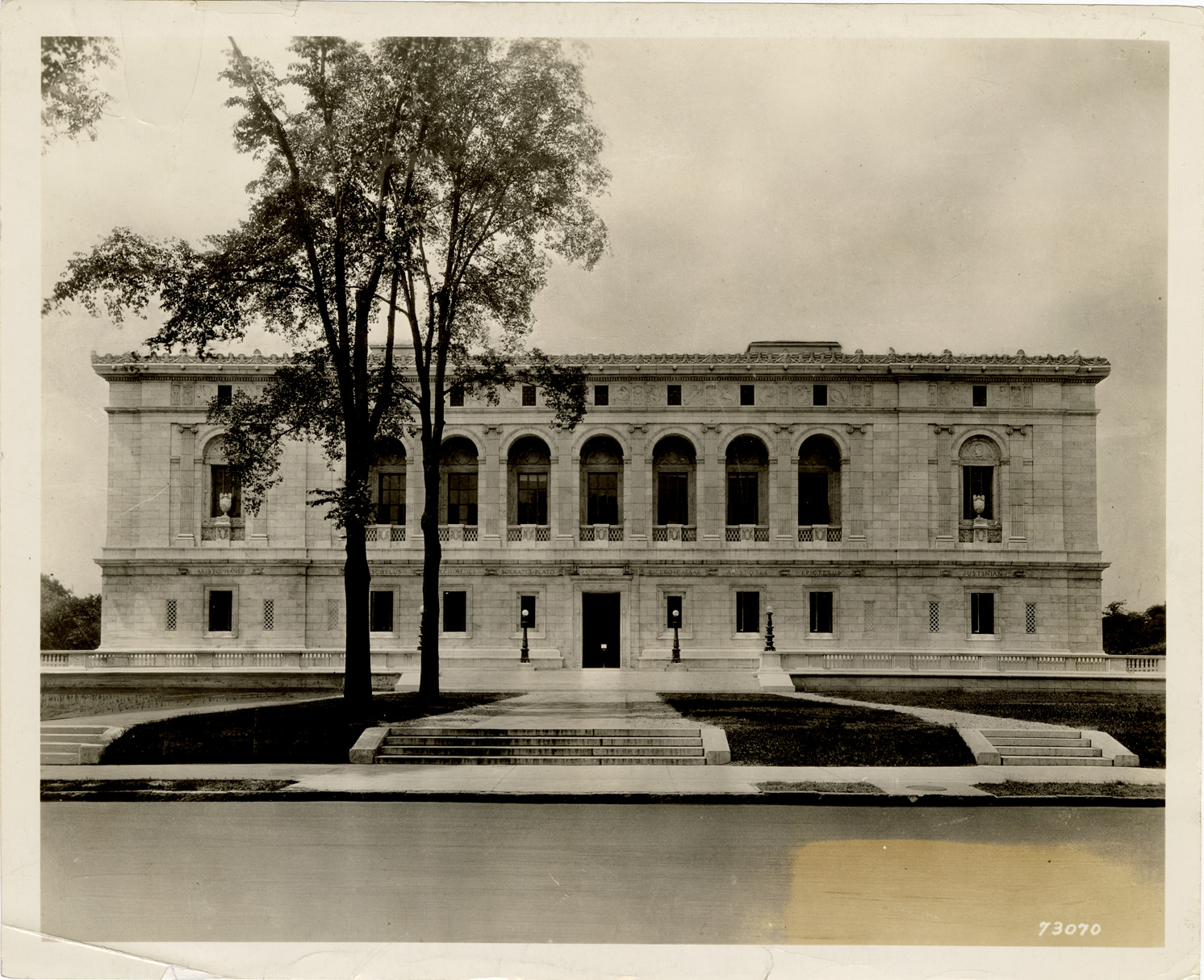 View of the Main Library, Detroit Public Library. Label on back: "Main Library, exterior." Stamped on back: "Manning Bros., Inc. Commercial photographers. 333 State St. Room 505. Detroit, Michigan." Typed on back: "Detroit Public Library. Main Library, front."