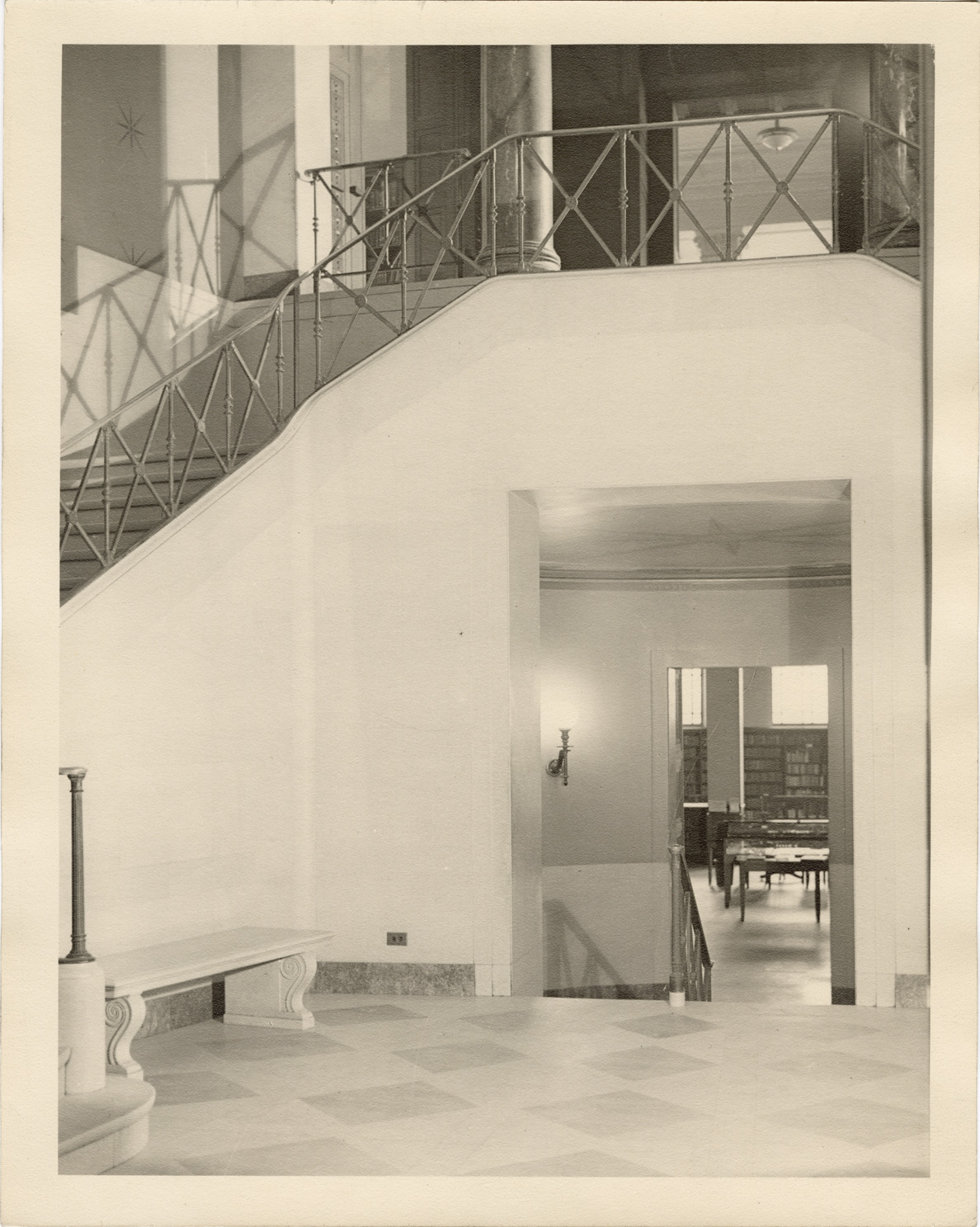 View of lobby with stairway to the second floor of the Downtown Library, now known as the Skillman Branch, Detroit Public Library. Typed on back: "Detroit Public Library. Downtown Library. Lobby showing stairway to 2nd floor (Foreign Language Dept. at rear)."