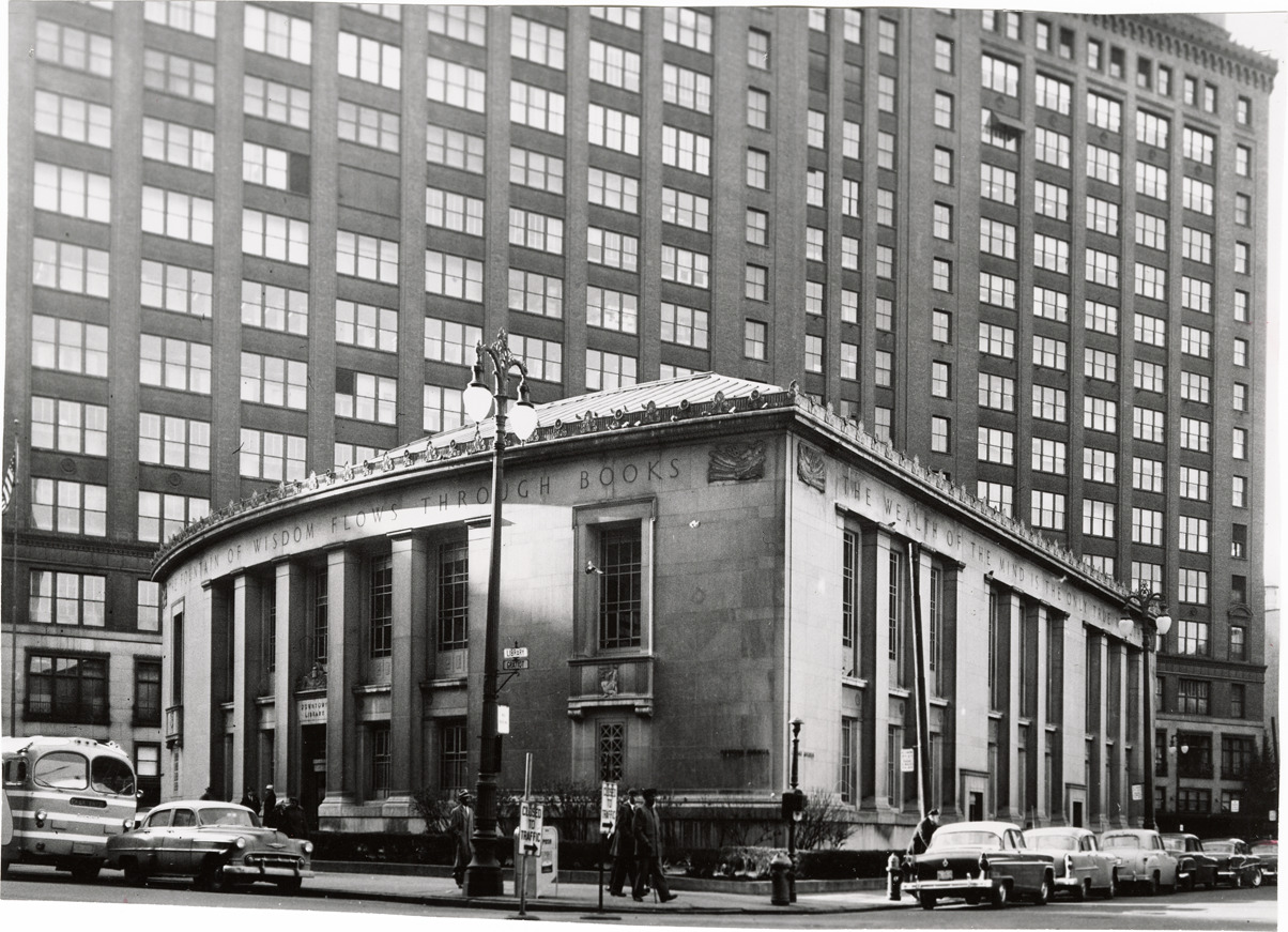 View of the Downtown Library, now known as the Skillman Branch, Detroit Public Library. Cars parked in street; pedestrians on sidewalk. Label on back: "Now today's downtown library branch opened its doors 25 years ago this month. An earlie library was built on the site in 1877. Detroit Free Press roto, Sunday, Jan. 6, 1957." Handwritten on back: "Opened its doors 25 years ago this month. F Sun. Jan. 6, 1957."