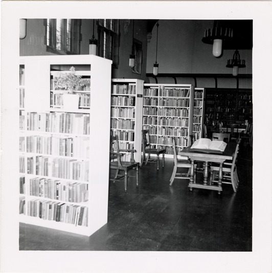View of the interior of the Monteith Branch Library, Detroit Public Library, showing bookshelves, chairs and table. Handwritten on back: "Monteith Branch, interior view, supplemental book shelving installed in main reading room, 1946. Photo taken in 1946."