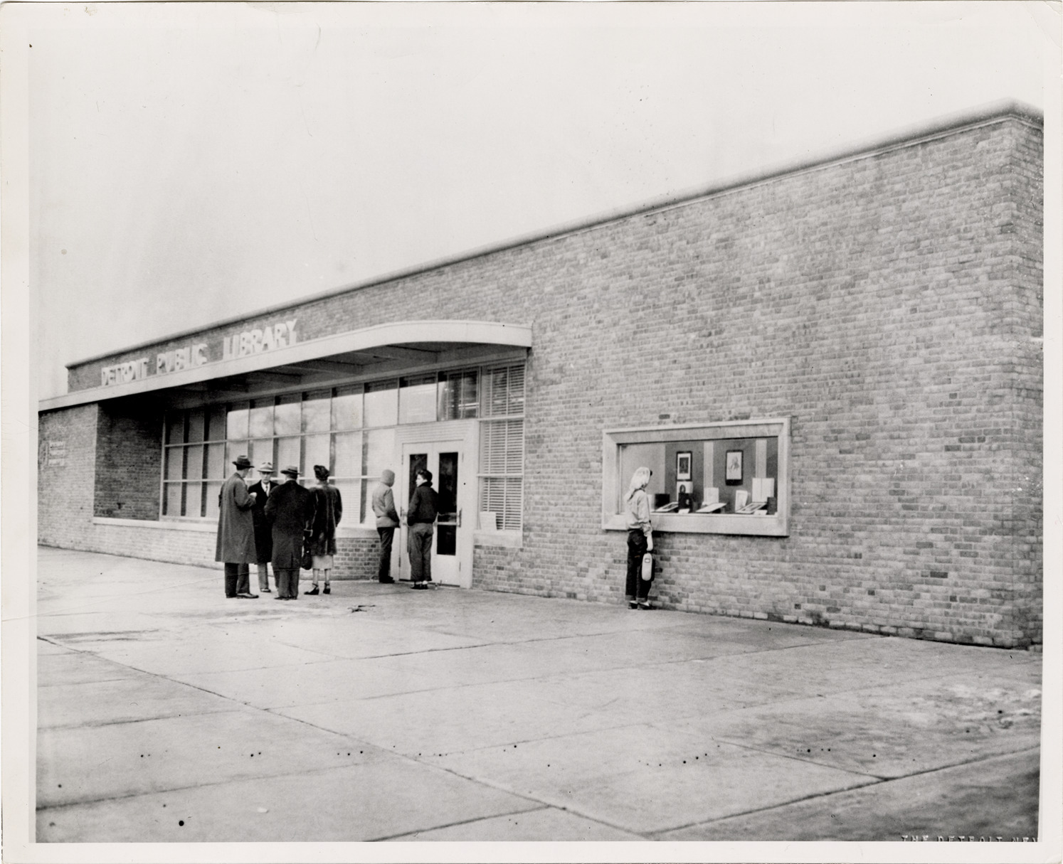 View of men and women standing in front of the Franklin Branch Library, Detroit Public Library. Typed on back: "Detroit Public Library. Benjamin Franklin Branch Library. Opened January 24, 1950."