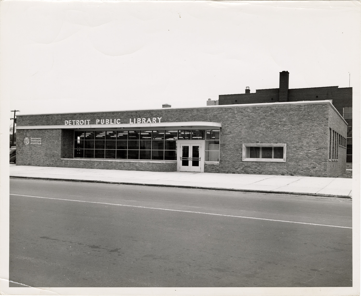 View of the Franklin Branch Library, Detroit Public Library. Label on front: "Detroit Public Library, Benjamin Franklin Branch, opened Jan. 24, 1950." Stamped on back: "Photo by M.R. Braidwood. Distinctive style in pictures. Venice 9-5575." Typed on back: "Detroit Public Library, Benjamin Franklin Branch Library, opened Jan. 24, 1950."