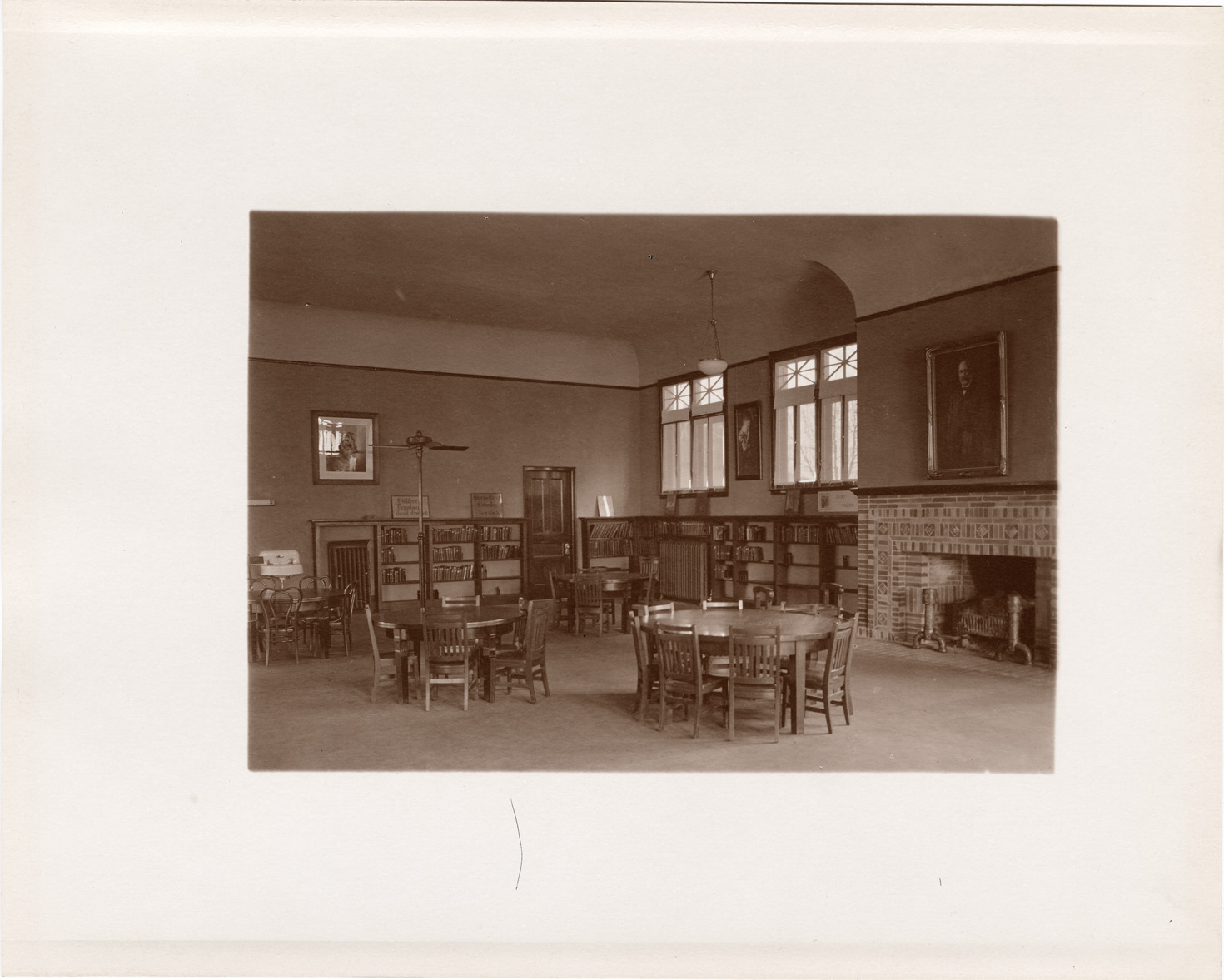 View of the Children's Room in the Gray Branch Library, Detroit Public Library. Room is furnished with fireplace, tables, chairs and bookshelves. Label on back: "Gray Branch Library, interior views." Handwritten on back: "Children's Department, John S. Gray Branch Library, 1914."
