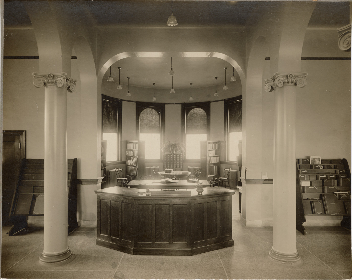 View of the delivery desk in the Hosmer Branch Library, Detroit Public Library. Card catalog, table, chairs and bookshelves in background. Label on back: "Hosmer Branch, delivery desk." Stamped on back: "C.C. Brewe, com'l photographer, 205 Griswold St., Detroit, Mich. General viewing, copying, developing and printing for amateurs."