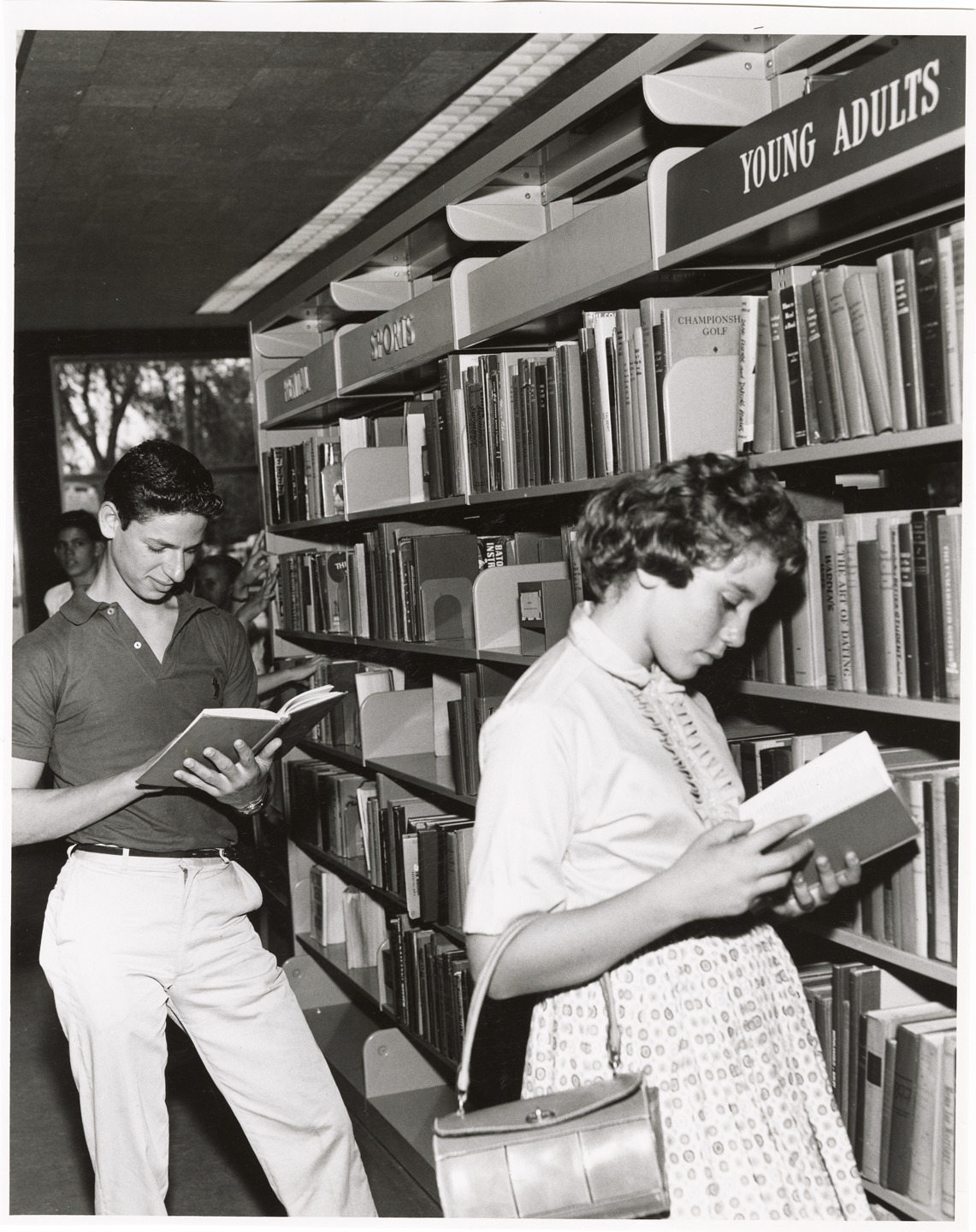 Favorite this☆ Teenagers perusing books, Hubbard Branch Library Description: View of two teens perusing books at the Hubbard Branch Library, Detroit Public Library. Bookshelves in background. Handwritten on back: "Hubbard Branch, interior view. Young adult readers interest section." Details Resource ID: bh019003 Subject: Detroit Public Library. Hubbard Branch Library buildings--Michigan--Detroit Branch libraries--Michigan--Detroit Public libraries--Michigan--Detroit Teenagers--Michigan--Detroit Shelving for books--Michigan--Detroit Photographic prints Date Issued: Unknown year Format: 1 photographic print ; 9.5 x 7.5 in. Member of: Burton Historical Collection Filing Location: D/Libraries-DPL-Branches-Hubbard Rights: Physical rights are retained by DPL. Copyright is retained in accordance with U.S. copyright laws.