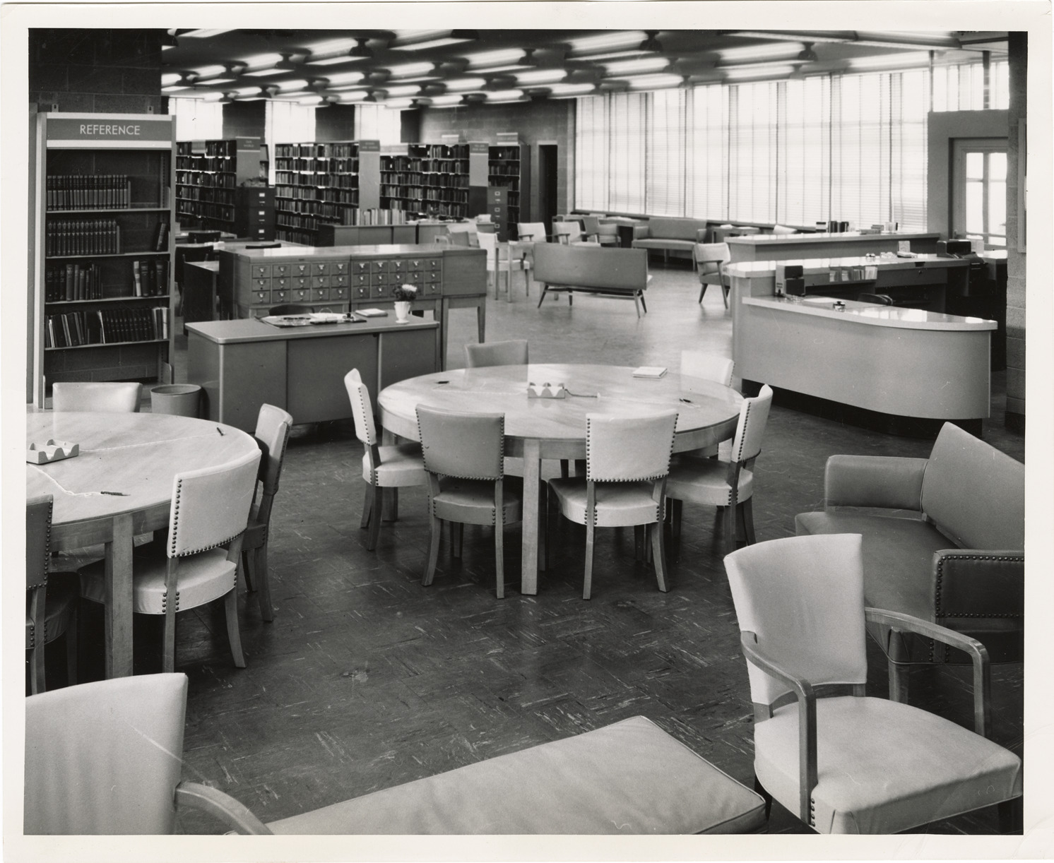 Interior view of the Knapp Branch Library, Detroit Public Library. Room is furnished with desks, tables, chairs and bookshelves. Typed on back: "Detroit Public Library. Elisabeth Knapp Branch, 133330 Conant Avenue. Dedicated Oct. 3, 1950." Stamped on back [covered by label]: "Photo by Phil Olsen." Handwritten on back: "Knapp Branch, interior view. Photo taken Oct. 3, 1950."