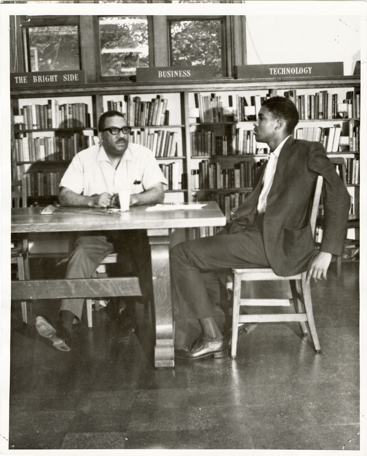 View of Dr. John Burton, City Pathologist, meeting with a young man during a vocational planning program at the Lothrop Branch Library, Detroit Public Library. Label on back: "Vocational planning program. Lothrop Branch Library. June 29, 1966. Young adults from Leadership Training Institute at Carter C.M.E. Church. Dr. John Burton, City Pathologist."