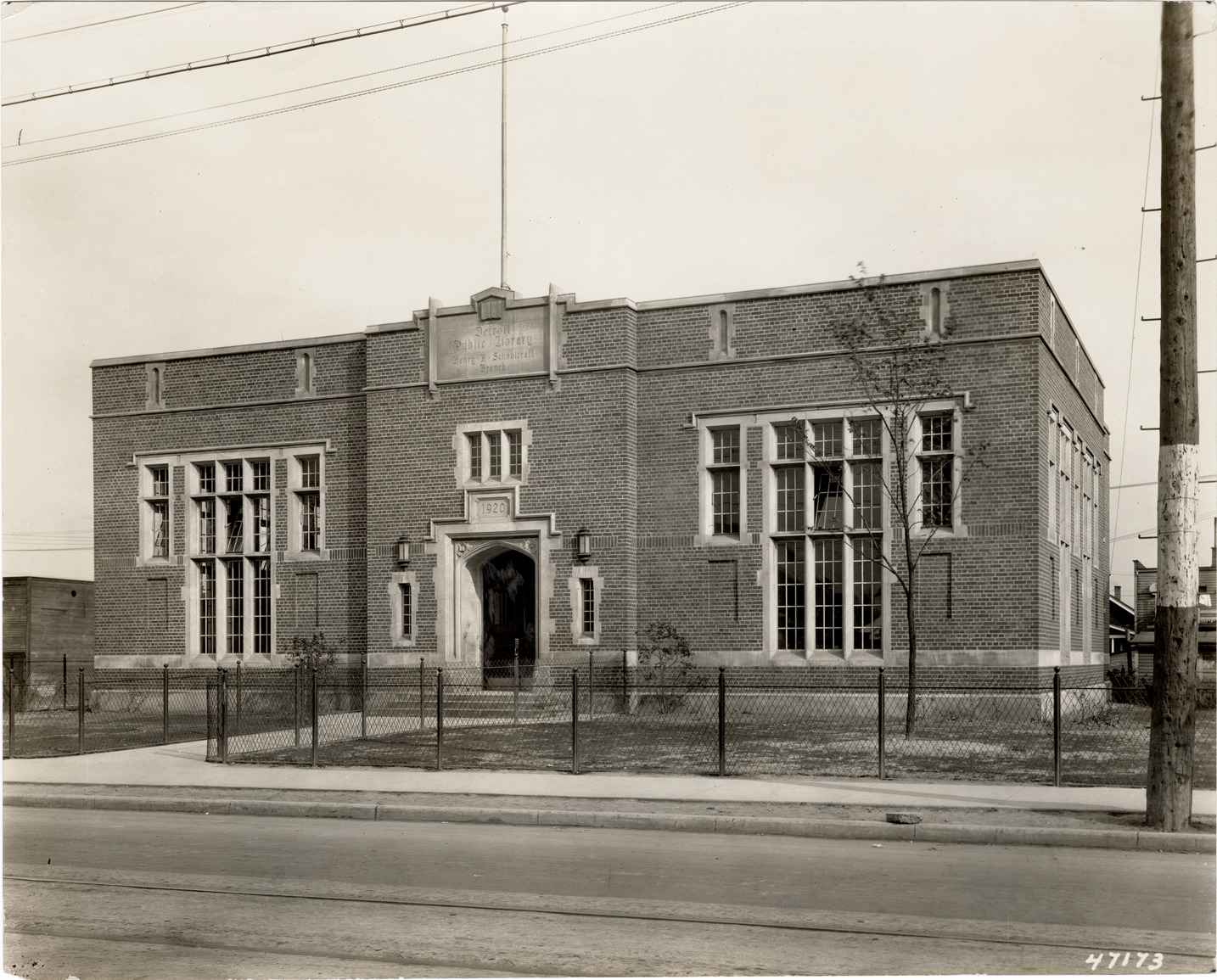View of the Schoolcraft Branch Library, Detroit Public Library. Stamped on back: "Manning Bros., commercial photographers. 504-505 Lincoln Building. Corner State and Park Sts., Detroit, Mich." Typed on back: "Detroit Public Library, Schoolcraft Branch."