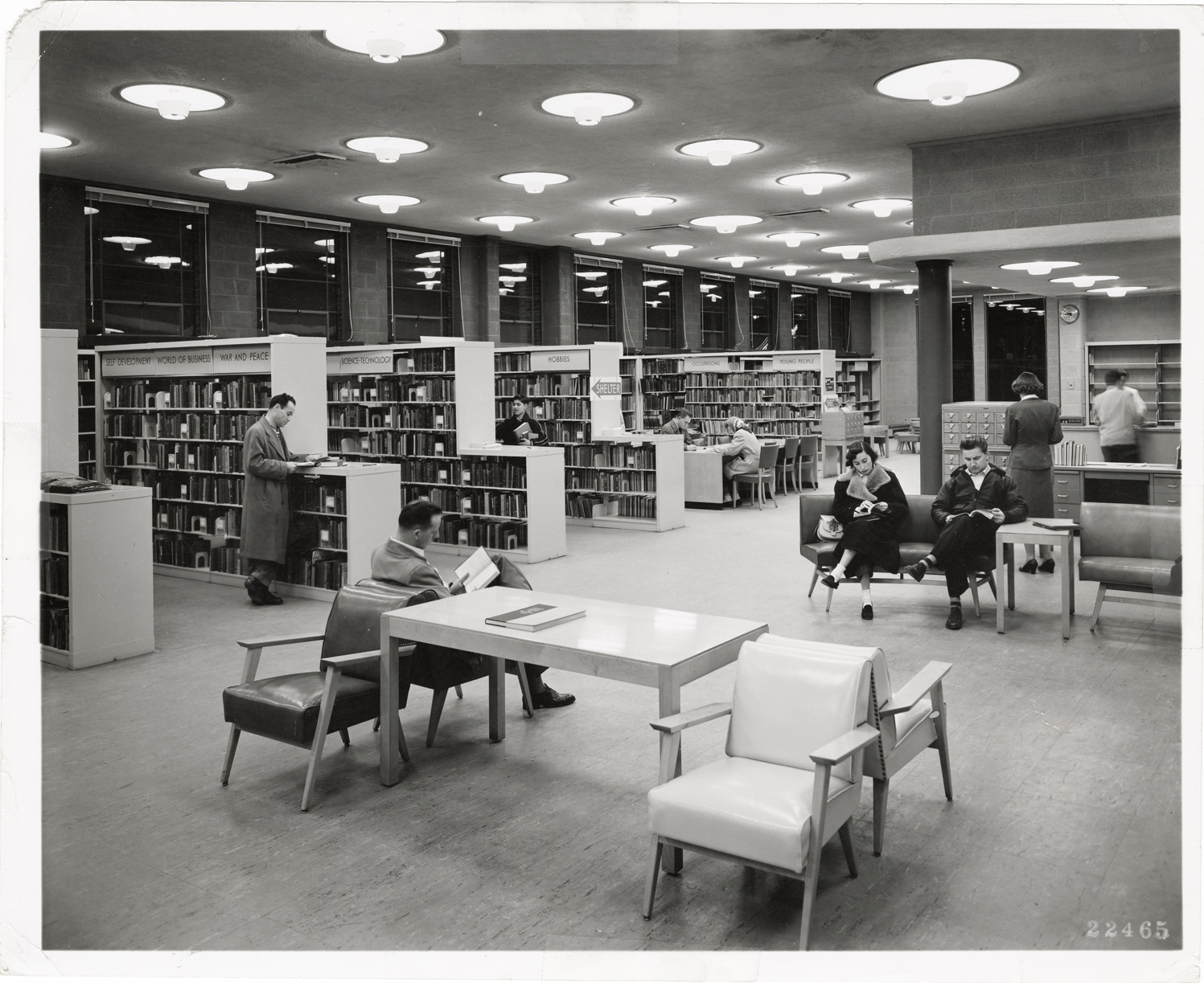 View of customers at the Sherwood Forest Branch Library, Detroit Public Library. Room is furnished with tables, chairs, desk and bookshelves. Typed on back: "Photograph, Sherwood Forest Branch Library, Detroit, Michigan. Taken by: General Electric Co. April 18, 1952. Permission given for use by: Chas. M. Mohrhardt, the General Electric Company (Paul S. Schmidt, Field Engineer). General Electric Company, 1400 Book Tower, Detroit 26, Michigan. Signed Charles M. Mohrhardt." Handwritten on back: "Sherwood Forest Branch, building, interior, adult room. Photo taken in 1952."