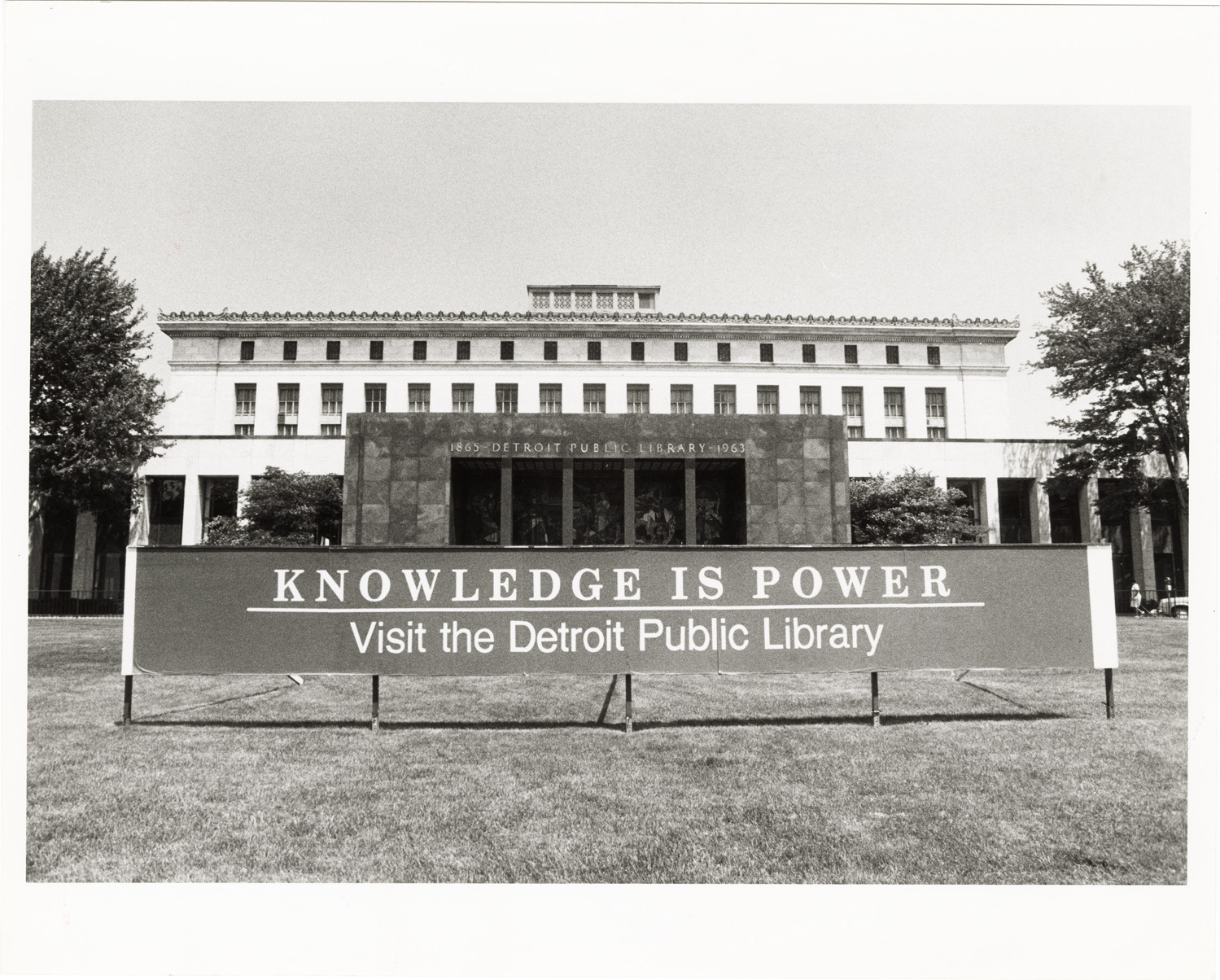 View of a banner displayed on lawn in front of the Cass Ave. entrance, Main Library, Detroit Public Library. Banner reads: "Knowledge is power. Visit the Detroit Public Library." Handwritten on back: "Main Library, exterior view, Cass Avenue addition looking east. Photo taken in 2005."