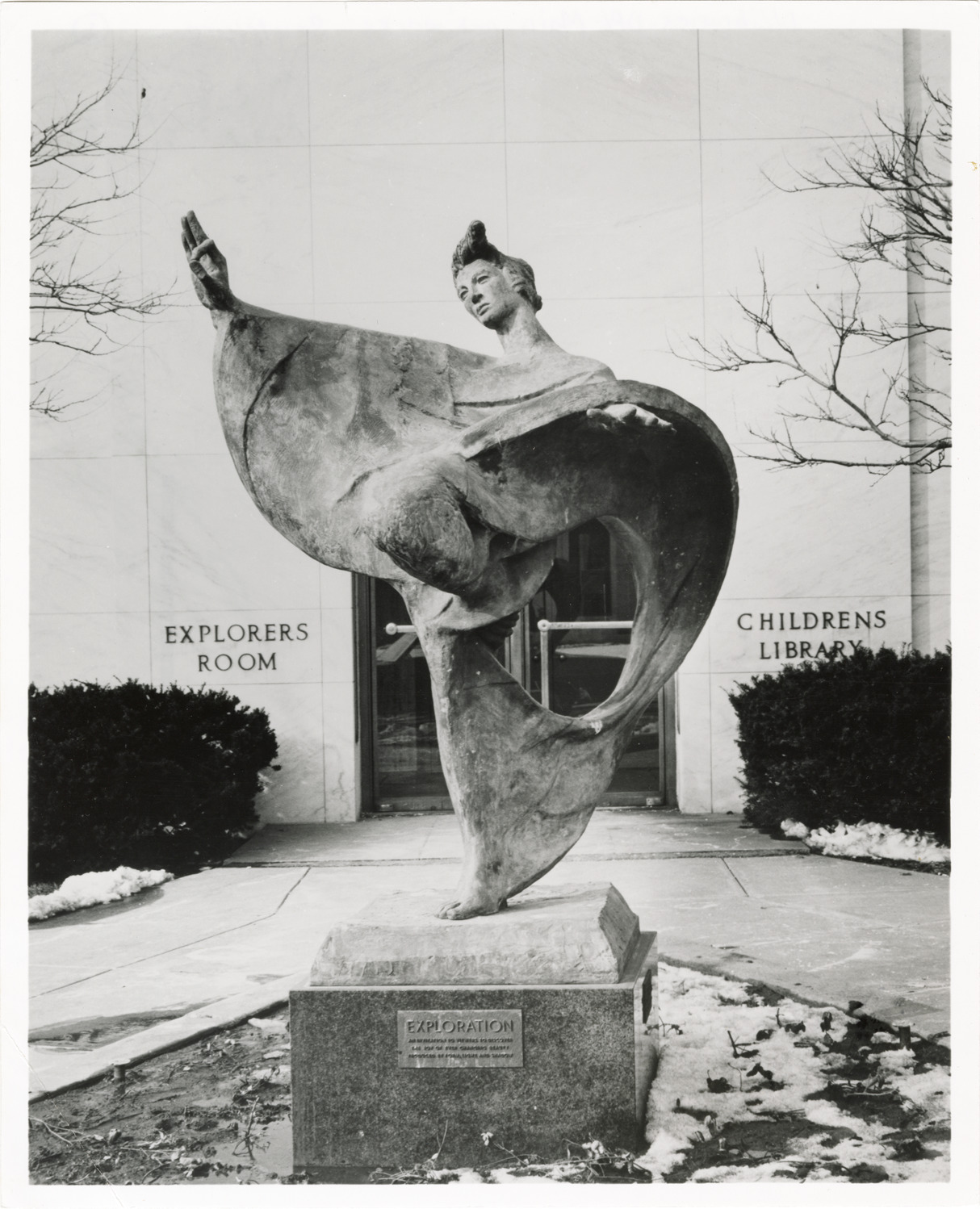 View of the bronze sculpture "Exploration" by Joseph N. DeLauro, installed near the entrance to the Children's Library on Cass Avenue, Main Library, Detroit Public Library. Label on back: "Sculpture 'Exploration' by Joseph N. DeLauro. Presented by Thomas G. Long. September, 1967. The bronze sculpture is located near the entrance to the Children's Library of Main Detroit Public Library. The plaque on the granite base defines the figure as 'an invitation to viewers to discover the joy of ever-changing beauty produced by form, light and shadow.'"