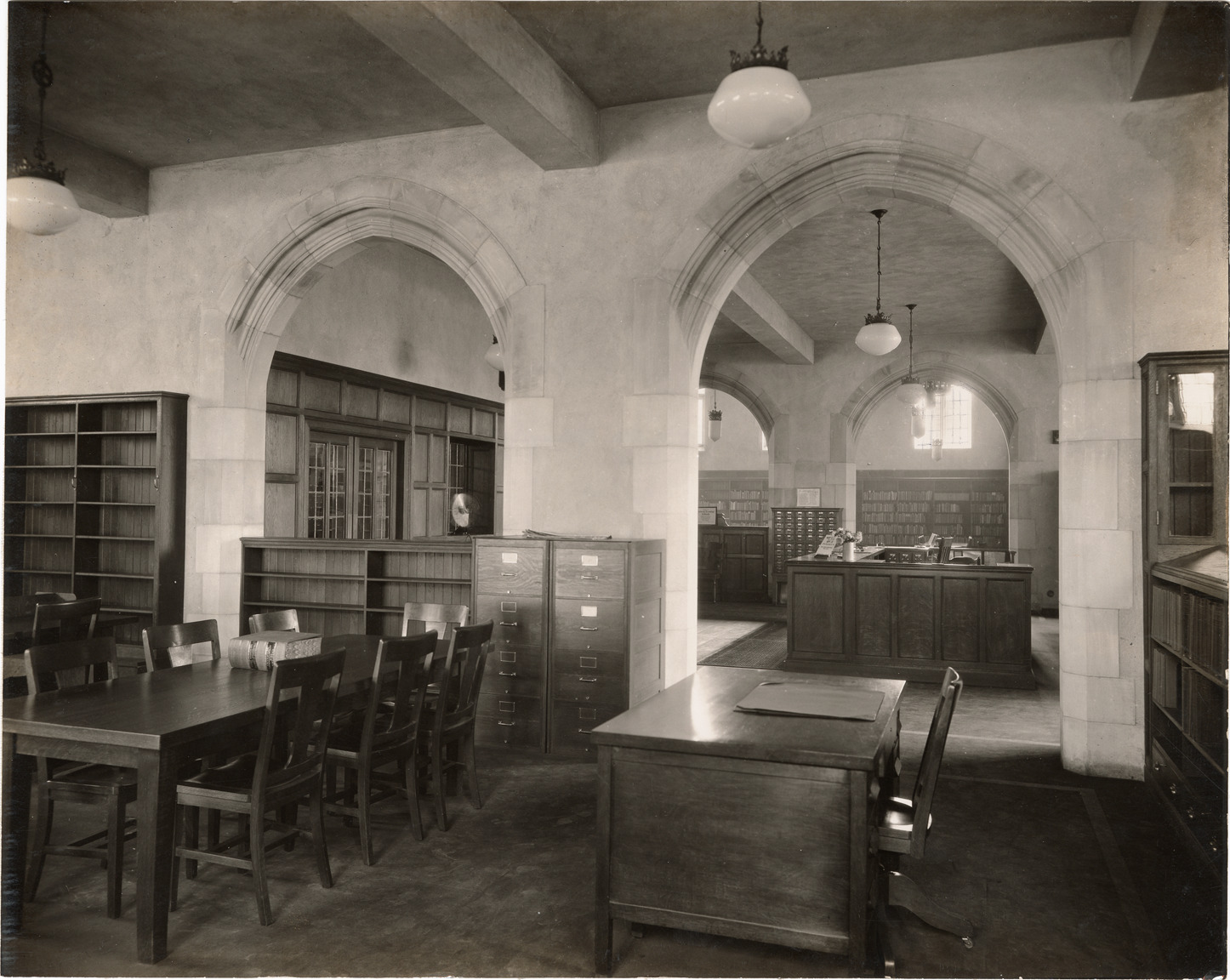 View of the interior of the Monteith Branch Library, Detroit Public Library, showing the adult charging desk in background. Desk, table and chairs in foreground. Stamped on back: "Thomas Ellison, photographer of architecture. 3105 Grand Boulevard E., Detroit." Typed on back: "Detroit Public Library, Monteith Branch. Adult charging desk."