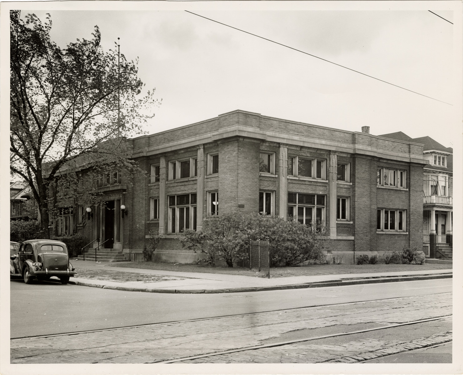 View of the Walker Branch Library, Detroit Public Library. Typed on back: "Walker Branch Library, 10720 Mack Avenue (14), 1920-21. Classical. 56' x 98'." Handwritten on back: "Walker Branch, building, exterior view. Photo taken in 1939."