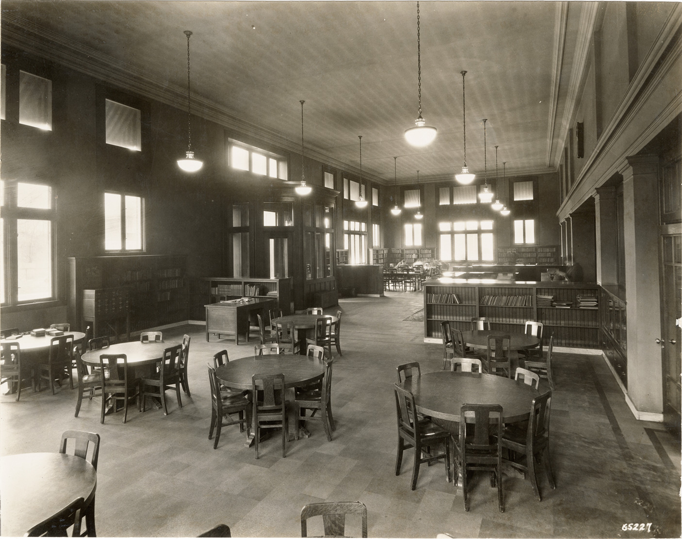 View of the Children's Room, Walker Branch Library, Detroit Public Library. Room is furnished with tables, chairs and bookshelves. Typed on back: "Detroit Public Library, Walker Branch. Children's Room looking toward Adult Room." Handwritten on back: "Walker Branch, building, interior view, Children's Room. Photo taken in 1922."