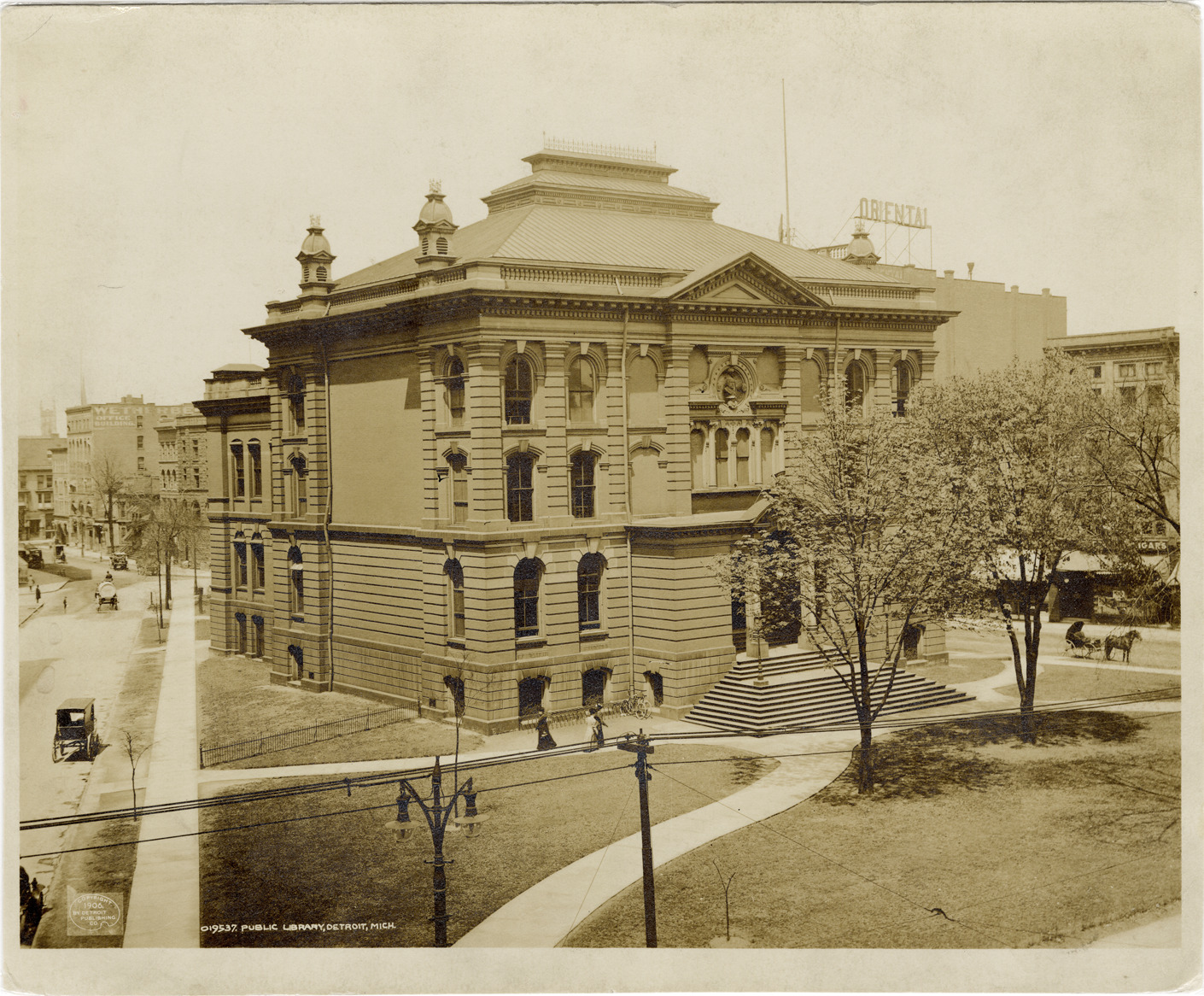 View of the Centre Park Library, Detroit Public Library; old building located on Gratiot Avenue between Library and Farmer Streets, between 1875 and 1921. Three-story brick building, with arched windows, bust of unknown figure carved into front, and steps leading to pillared entranceway. Printed on front: "Copyright 1906, Detroit Publishing Co. Public Library, Detroit, Mich."