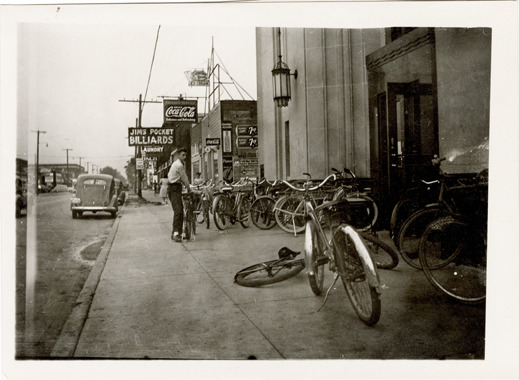 View of bicycles in front of the Fenkell Street Branch Library, Detroit Public Library. Teenage boy stands next to bicycle; sign for Jim's Pocket Billiards in background. Handwritten on back: "1939."