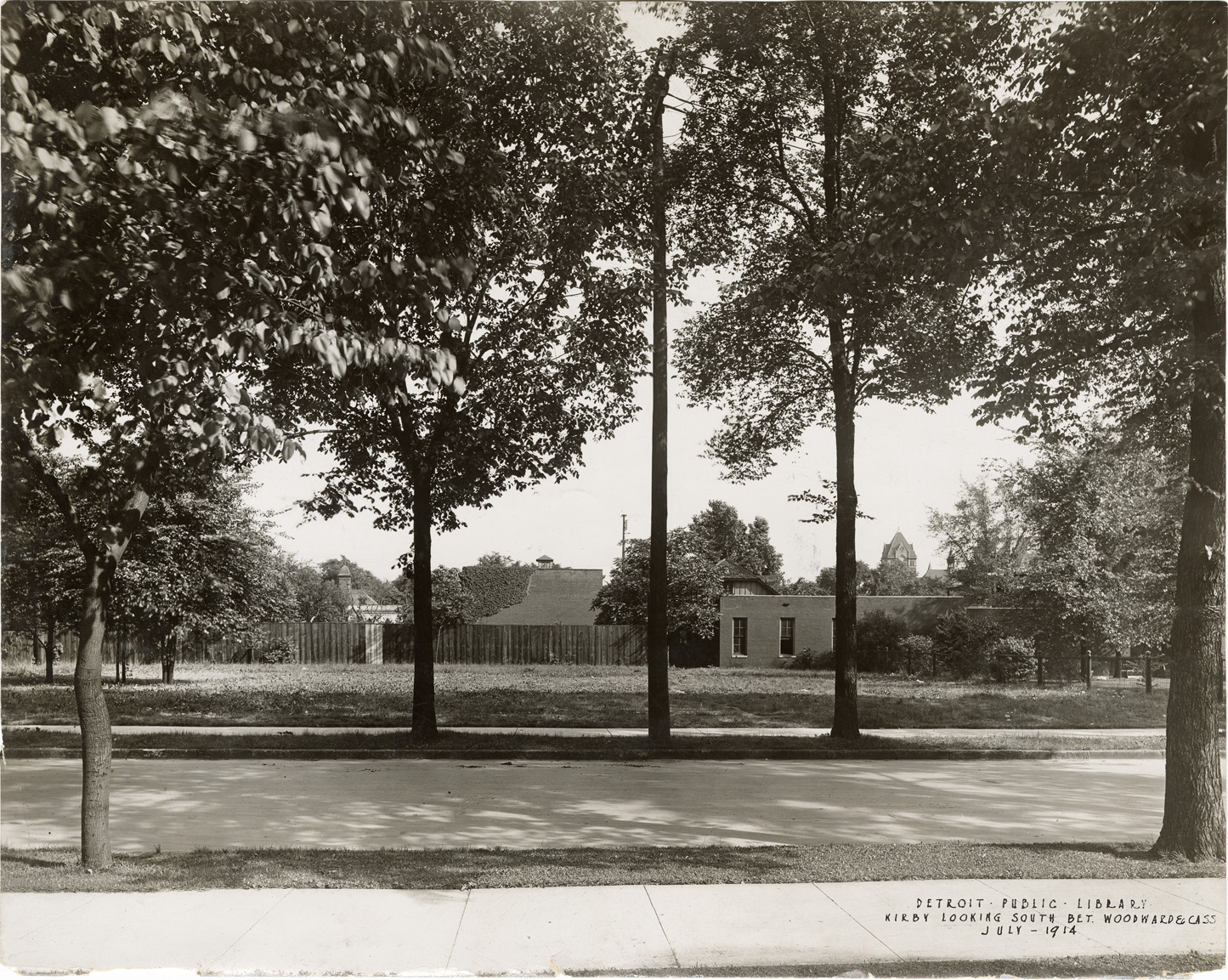 View of Kirby St. between Woodward Ave. and Cass Ave., showing a vacant lot. Photograph was taken prior to the construction of the new Main Library, Detroit Public Library, which is bordered by Woodward Ave., Cass Ave., Kirby St. and Putnam St. Printed on front: "Detroit Public Library, Kirby looking south bet. Woodward & Cass. July 1914." Handwritten on back: "Kirby looking south between Woodward & Cass."