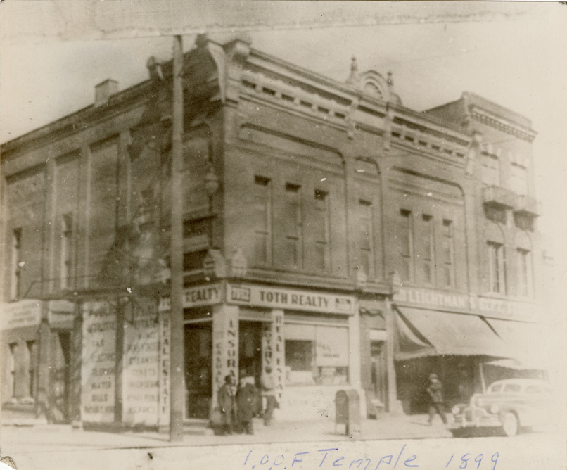 View of the International Order of Odd Fellows Temple, Delray neighborhood. Handwritten on front: "I.O.O.F. Temple, 1899." Label on back: "Odd Fellow [sic] Temple. West Jef. & West End."