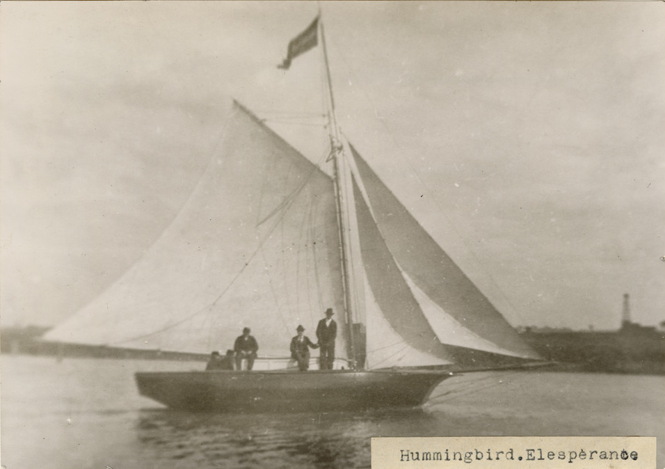 Favorite this☆ Sailboat "Hummingbird" Description: View of the sailboat "Hummingbird." Label on front: "Hummingbird. Elesperance." Details Resource ID: bh019260 Subject: Sailboats--Michigan--Detroit Photographic prints Date Issued: Unknown year Format: 1 photographic print ; 4.5 x 6.5 in. Member of: Burton Historical Collection Filing Location: M/Localities-Delray-Boats and boating Rights: Physical rights are retained by DPL. Copyright is retained in accordance with U.S. copyright laws.