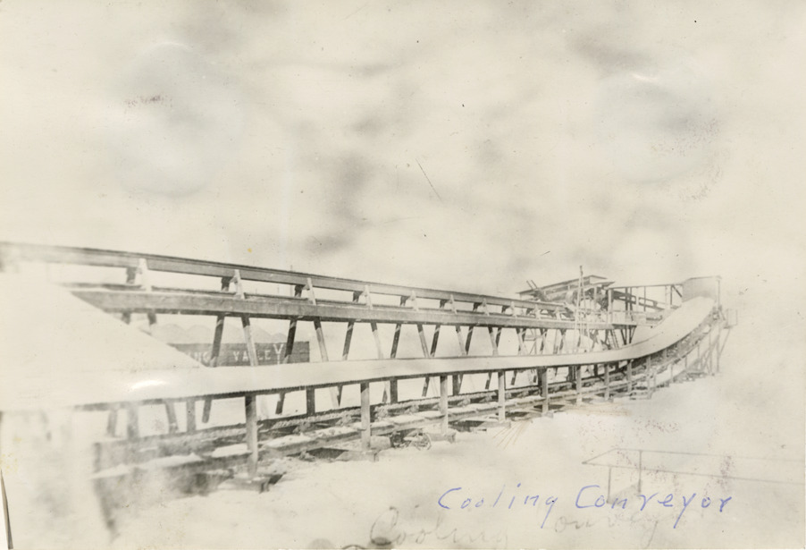 View of a cooling conveyor at unidentified factory, Delray neighborhood. Handwritten on front: "Cooling conveyor."