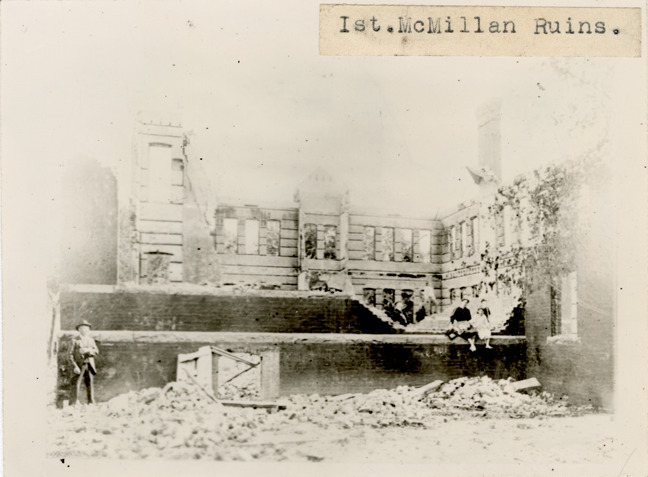 View of men posing with ruins of the McMillan School, Delray neighborhood. Label on front: "1st McMillan ruins."