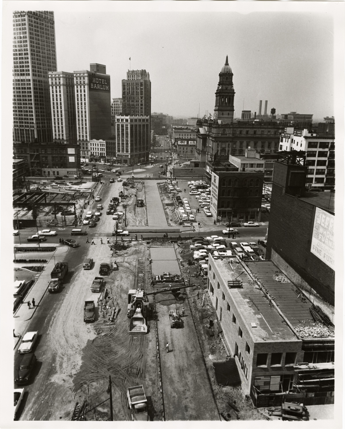 Bird's-eye view of construction to widen Randolph St. Hotel Barlum, Wayne County Building and commercial buildings in background.