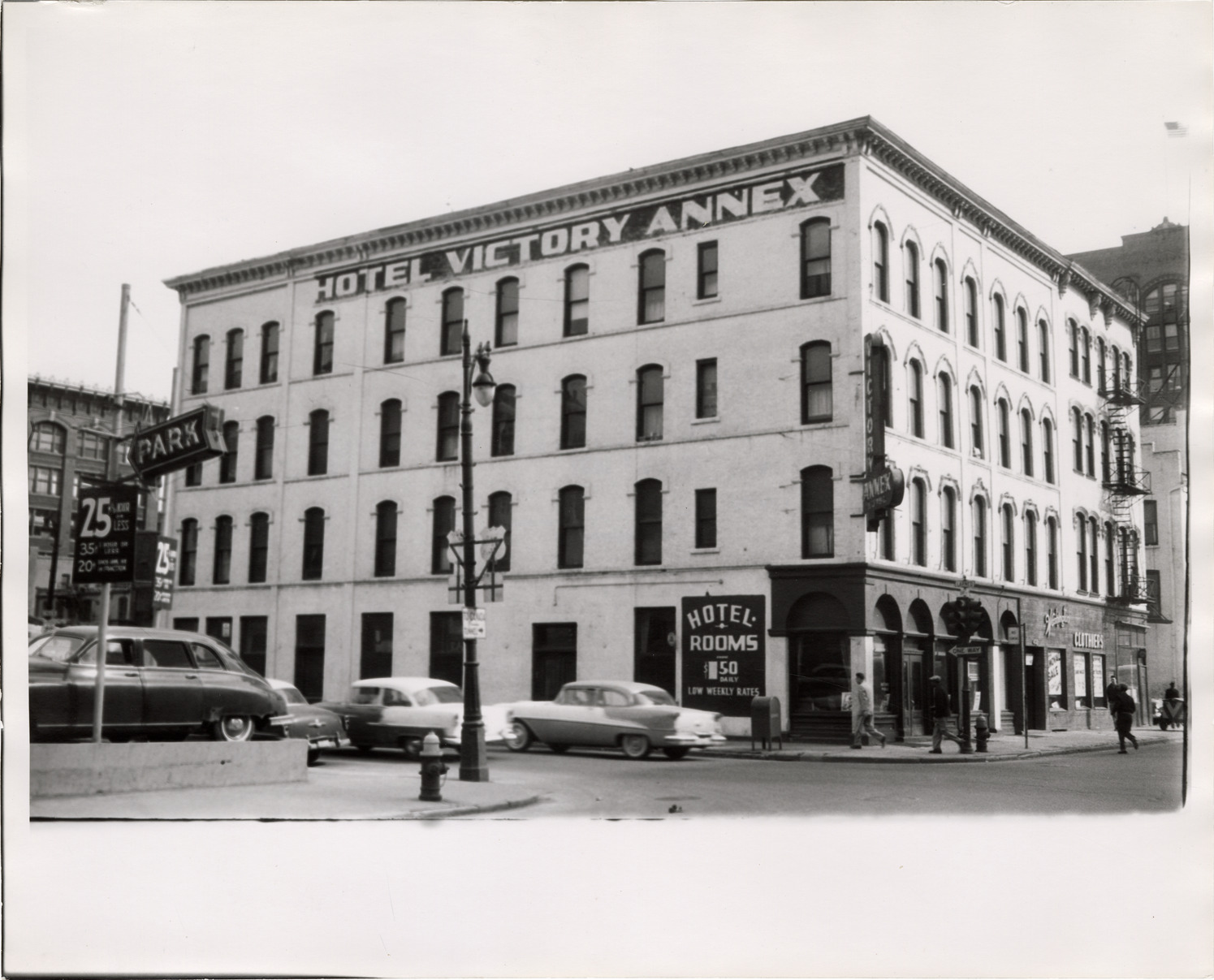 Favorite this☆ Hotel Victory annex Description: View of the Hotel Victory annex. Parking lot sign in foreground; automobiles are parked in street. Stamped on back: "Taylor. Date: Mar 27, 1957. Location: [blank]. City Plan Commission." Details Resource ID: bh019360 Creator: Taylor Subject: Hotels--Michigan--Detroit Automobiles--Michigan--Detroit Detroit Housing Commission--Archives Photographic prints Date Issued: 1957-03-27 Format: 1 photographic print ; 8 x 10 in. Member of: Burton Historical Collection Filing Location: MS/Detroit Archives. Housing Commission. Randolph widening. 57:5 Rights: Physical rights are retained by DPL. Copyright is retained in accordance with U.S. copyright laws.
