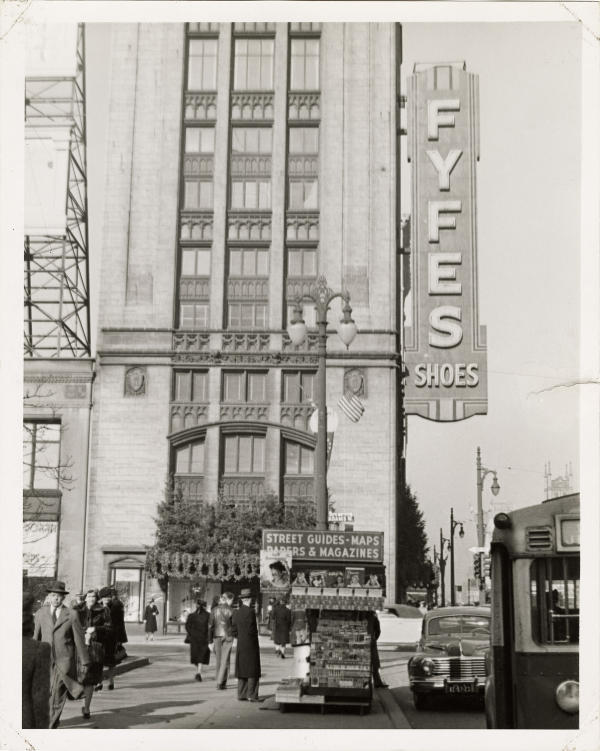Favorite this☆ Newsstand in front of Fyfe's Shoes Description: View of a newsstand in front of the Fyfe's Shoes building at Woodward Avenue and Adams Street. Sign reads: "Street guides, maps, papers & magazines." Pedestrians on sidewalk. Details Resource ID: bh019366 Subject: Shoe stores--Michigan--Detroit Newsstands--Michigan--Detroit Neon signs--Michigan--Detroit Detroit Housing Commission--Archives Photographic prints Date Issued: 1957 Format: 1 photographic print ; 10 x 8 in. Member of: Burton Historical Collection Filing Location: MS/Detroit Archives. Housing Commission. Central business district, general, 1957. 57:7 Rights: Physical rights are retained by DPL. Copyright is retained in accordance with U.S. copyright laws.