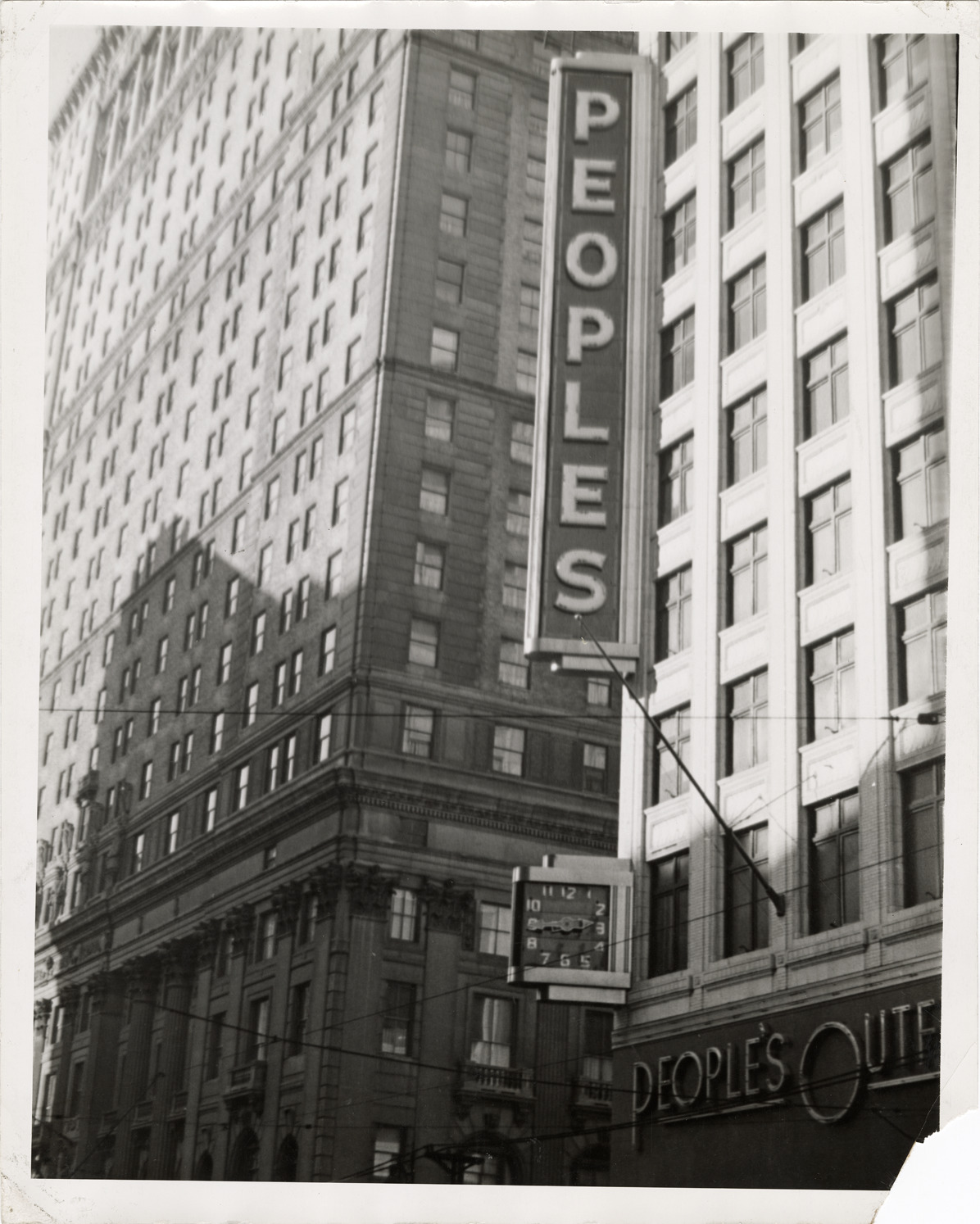 Favorite this☆ Neon sign for Peoples Outfitting Company Description: Close-up view of a neon sign for the Peoples Outfitting Co. Clock is displayed below sign. Details Resource ID: bh019367 Subject: Neon signs--Michigan--Detroit Department stores--Michigan--Detroit Clocks and watches--Michigan--Detroit Detroit Housing Commission--Archives Photographic prints Date Issued: 1957 Format: 1 photographic print ; 10 x 8 in. Member of: Burton Historical Collection Filing Location: MS/Detroit Archives. Housing Commission. Central business district, general, 1957. 57:7 Rights: Physical rights are retained by DPL. Copyright is retained in accordance with U.S. copyright laws.