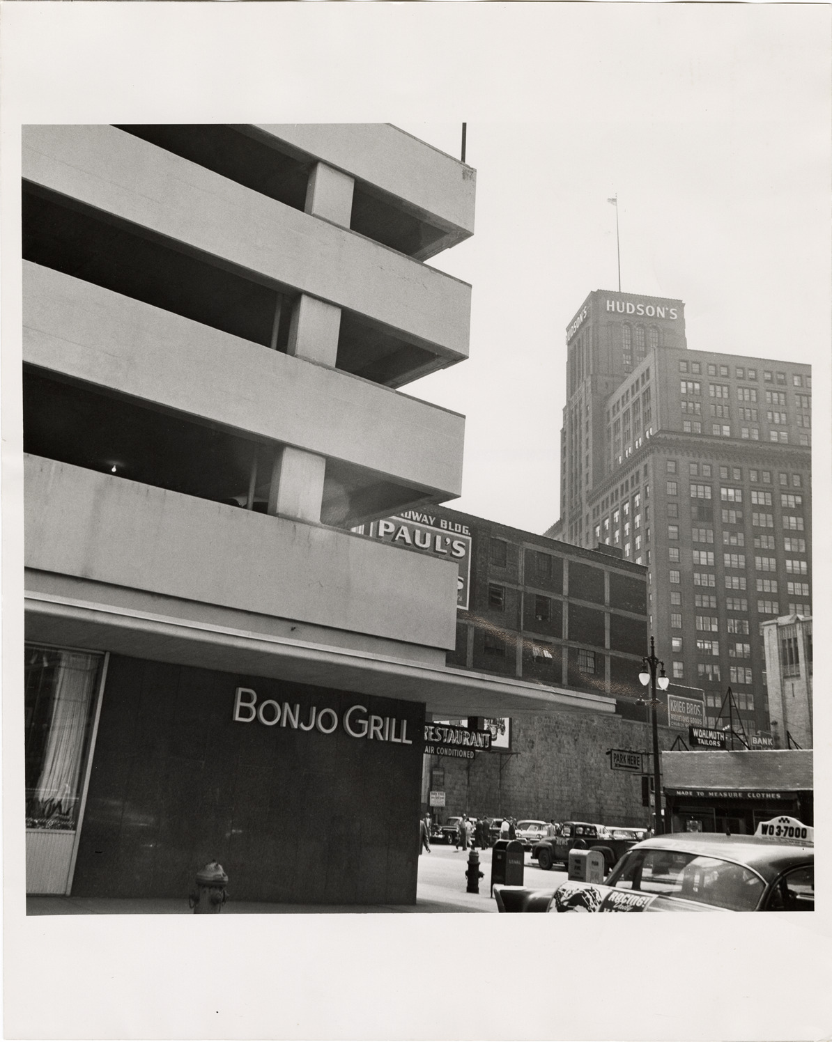 Favorite this☆ Bonjo Grill and J.L. Hudson building Description: View of the Bonjo Grill with J.L. Hudson's building in the background. Details Resource ID: bh019368 Subject: Restaurants--Michigan--Detroit Department stores--Michigan--Detroit J.L. Hudson Company Detroit Housing Commission--Archives Photographic prints Date Issued: 1957 Format: 1 photographic print ; 10 x 8 in. Member of: Burton Historical Collection Filing Location: MS/Detroit Archives. Housing Commission. Central business district, general, 1957. 57:7 Rights: Physical rights are retained by DPL. Copyright is retained in accordance with U.S. copyright laws.