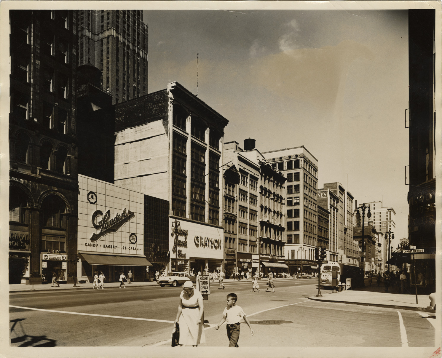 Favorite this☆ Commercial buildings on Woodward Avenue Description: View of commercial buildings on Woodward Ave. Businesses include Sanders, Mary Jane Shoes and Grayson. Pedestrians cross streets. Details Resource ID: bh019375 Subject: Commercial buildings--Michigan--Detroit Woodward Avenue (Mich.) Streets--Michigan--Detroit Detroit Housing Commission--Archives Photographic prints Date Issued: 1957 Format: 1 photographic print ; 8 x 10 in. Member of: Burton Historical Collection Filing Location: MS/Detroit Archives. Housing Commission. Lower Woodward and Griswold, 1957. 57:11 Rights: Physical rights are retained by DPL. Copyright is retained in accordance with U.S. copyright laws.
