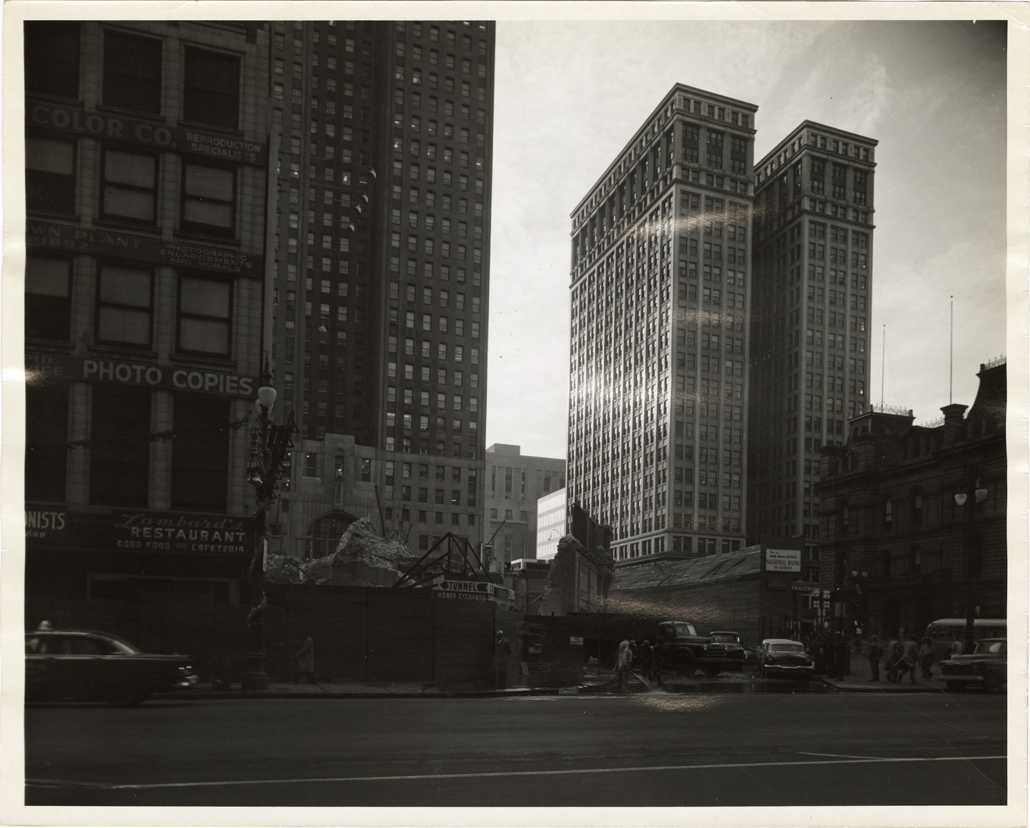 Favorite this☆ Dime Building and building undergoing demolition on Griswold Street Description: View of the Dime Building and building undergoing demolition on Griswold St. Stamped on back: "Taylor. Date: Dec 1956. Location: [blank]. City Plan Commission." Details Resource ID: bh019386 Creator: Taylor Subject: Skyscrapers--Michigan--Detroit Lost architecture--Michigan--Detroit Wrecking--Michigan--Detroit Office buildings--Michigan--Detroit Bank buildings--Michigan--Detroit Detroit Housing Commission--Archives Photographic prints Date Issued: 1956-12 Format: 1 photographic print ; 8 x 10 in. Member of: Burton Historical Collection Filing Location: MS/Detroit Archives. Housing Commission. Lower Woodward and Griswold, 1957. 57:11 Rights: Physical rights are retained by DPL. Copyright is retained in accordance with U.S. copyright laws.