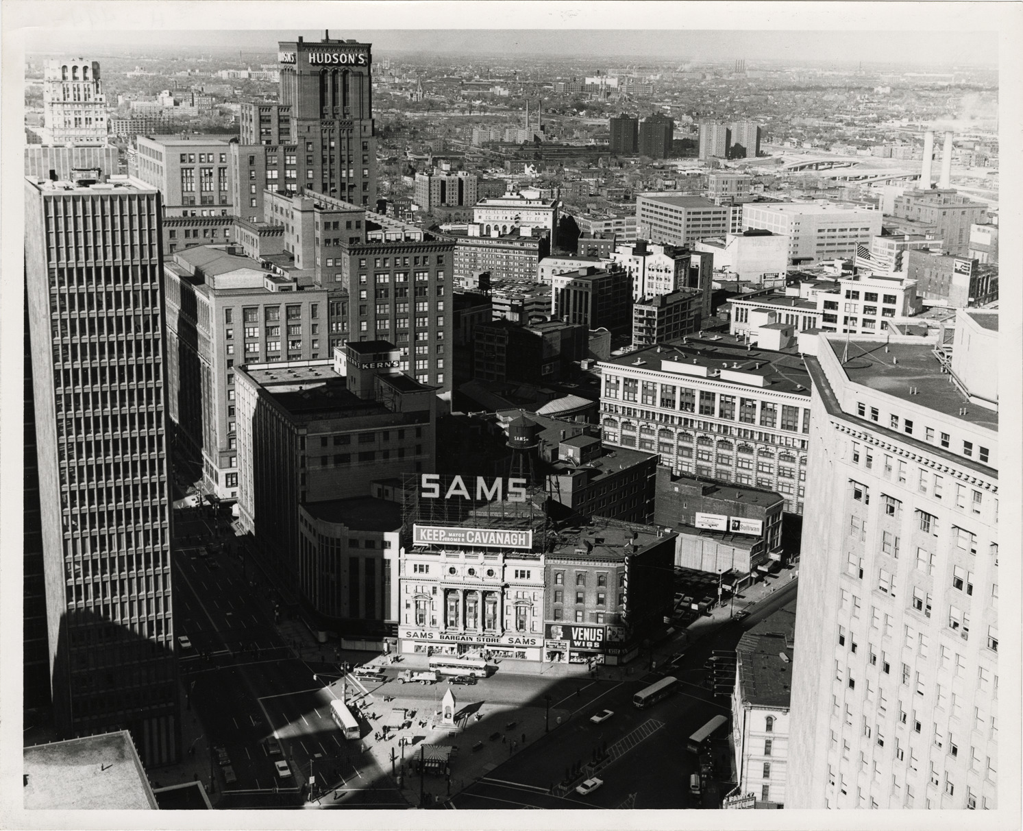 Favorite this☆ Aerial view of buildings in downtown Detroit Description: View of commercial and office buildings in downtown Detroit, Michigan. Sam's Bargain Store in foreground. Details Resource ID: bh019391 Subject: Commercial buildings--Michigan--Detroit Office buildings--Michigan--Detroit Skyscrapers--Michigan--Detroit Detroit Housing Commission--Archives Photographic prints Date Issued: 1957 Format: 1 photographic print ; 8 x 10 in. Member of: Burton Historical Collection Filing Location: MS/Detroit Archives. Housing Commission. Lower Woodward and Griswold, 1957. 57:13 Rights: Physical rights are retained by DPL. Copyright is retained in accordance with U.S. copyright laws.