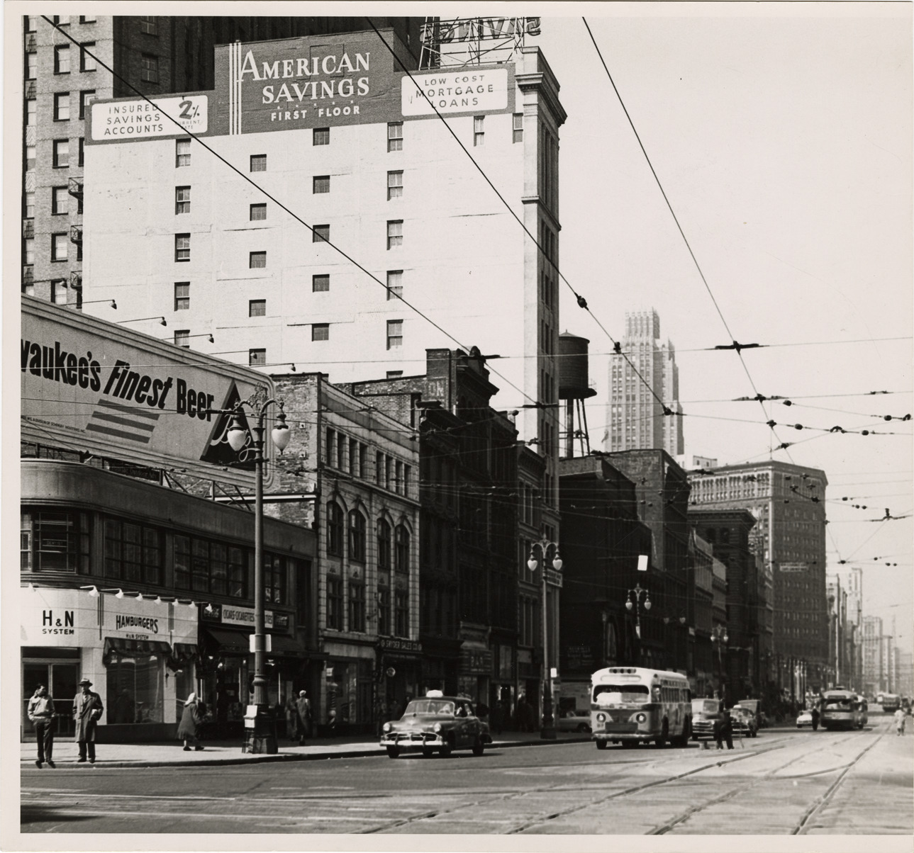 View of commercial buildings near the corner of Woodward Ave. and Jefferson Ave. Taxicabs, automobiles and buses in street. Handwritten on back: "Woodward at Jefferson. New Gas Co. & Nat. Bank site."