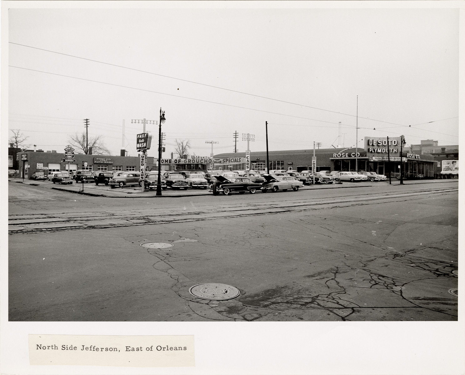 View of the Rose Co. car dealership on Jefferson Ave., east of Orleans St. Signs on building include: "Rose Co. fast auto wash," "DeSoto Plymouth," "Rose Co.," "Used cars," and "Home of Groucho top value specials." Label on front: "North side Jefferson, east of Orleans." Stamped on back: "Detroit City Plan Commission. Photograph by Harold Raymond."