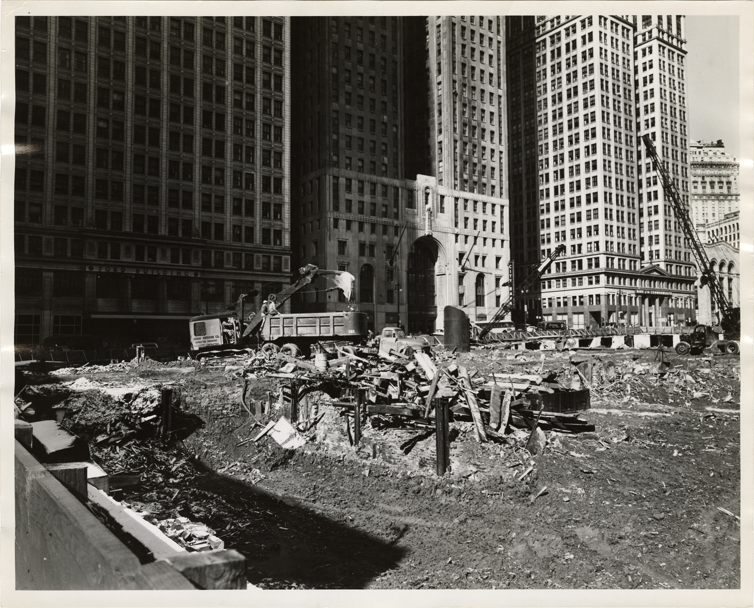 View of a power shovel and truck on the site of building demolition. The demolition was in preparation for the future site of the National Bank of Detroit building. Dime Building and Penobscot Building are in background. Handwritten on back: "April, 1957."