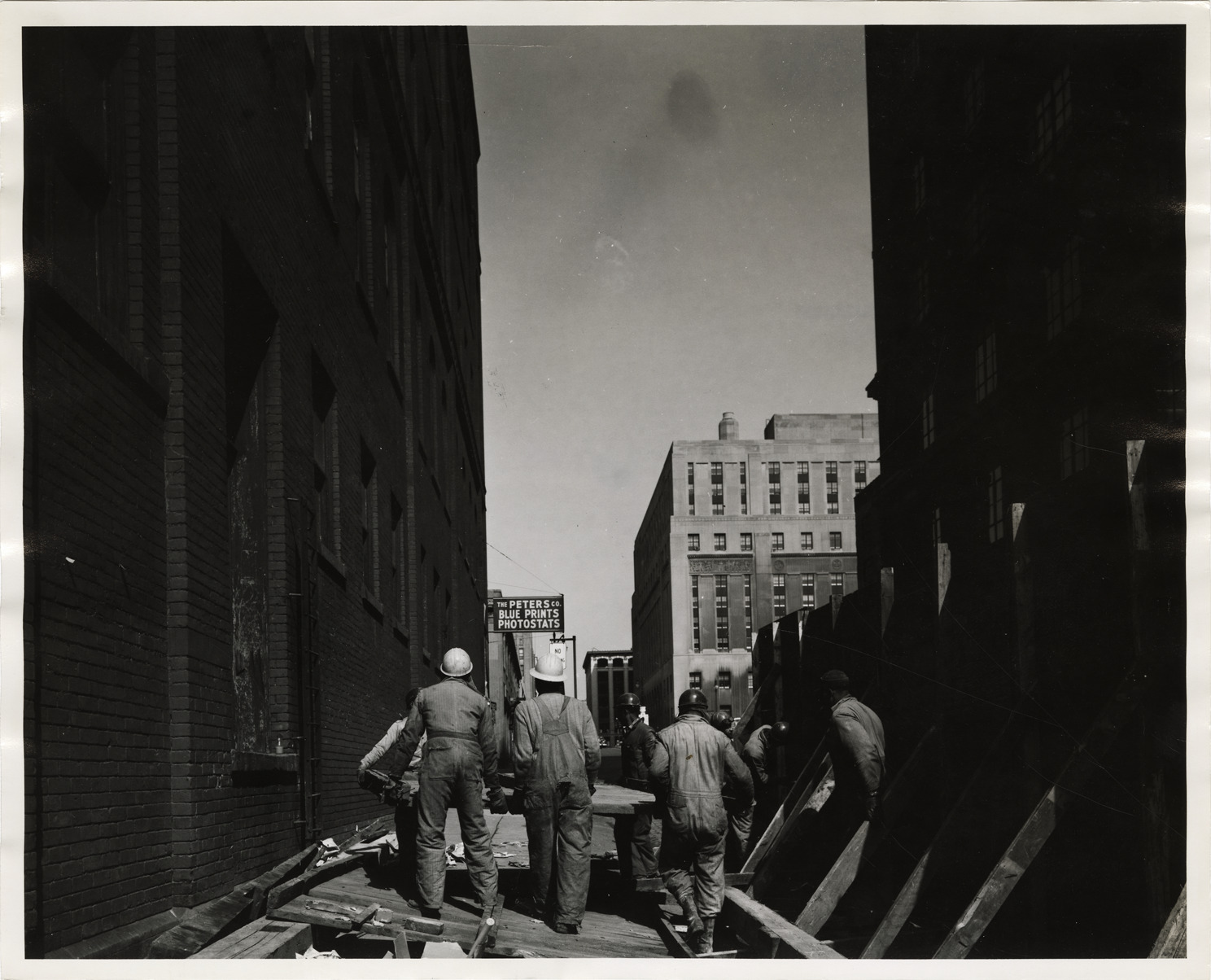View of construction workers on Wayne St. Sign on brick building reads: "The Peters Co. Blue prints, photostats." Stamped on back: "Taylor. Date: May 8, 1957. Location: [blank]. City Plan Commission."