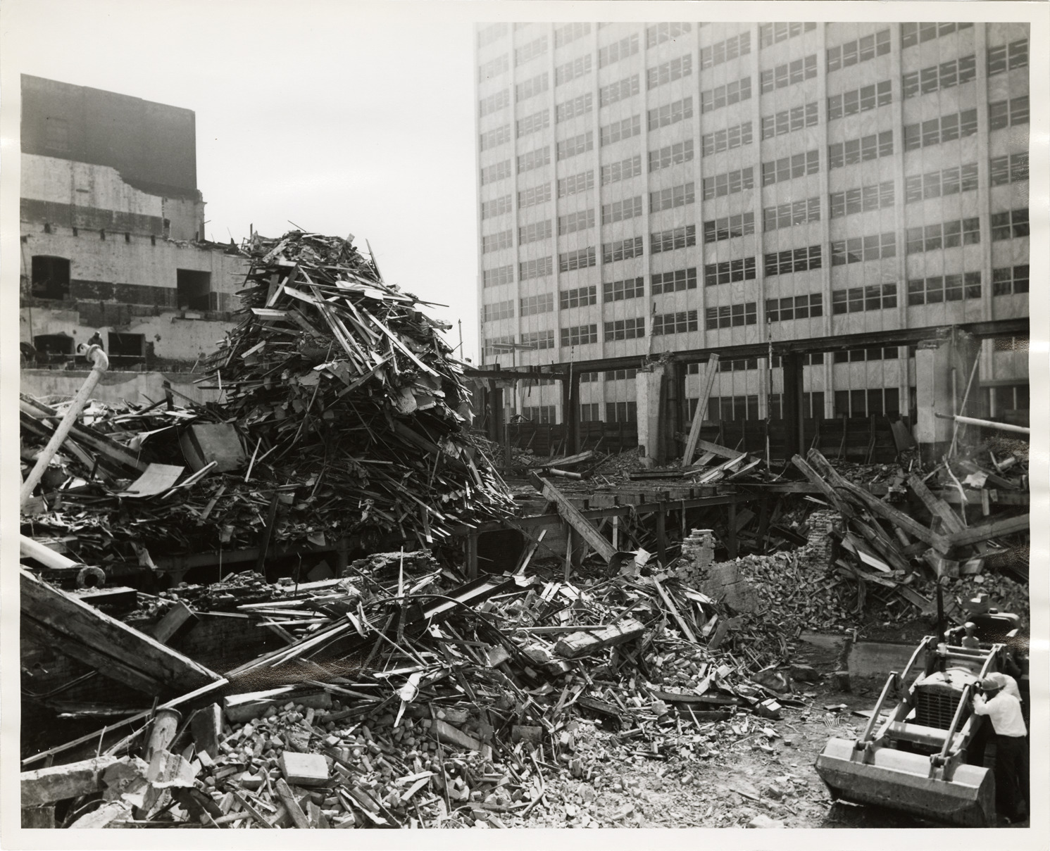 View of demolition debris on future site of the Greyhound Bus Terminal. Stamped on back: "Taylor. Date: May 7, 1957. Location: [blank]. City Plan Commission."