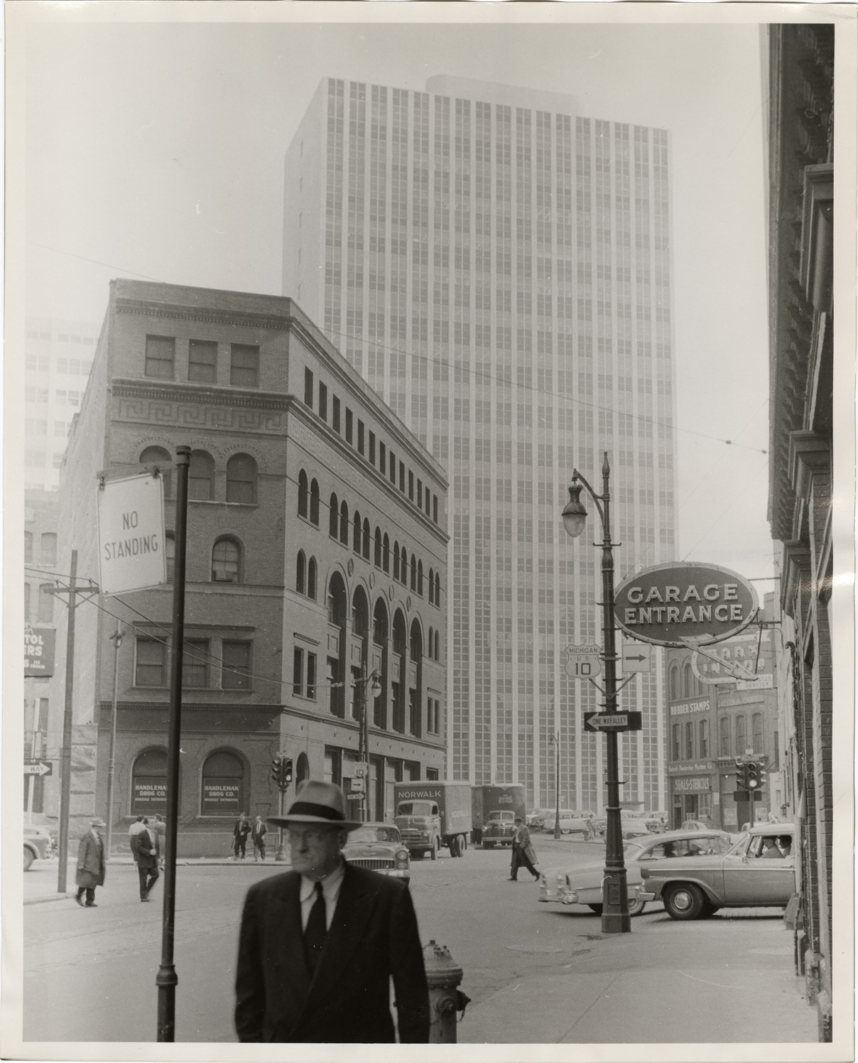 View of a brick building located on Congress St. Handleman Drug Co. on first floor. Pedestrian in foreground; lamppost and neon sign reading "Garage entrance" in background. Stamped on back: "Taylor. Date: Jan 1957. Location: [blank]. City Plan Commission."