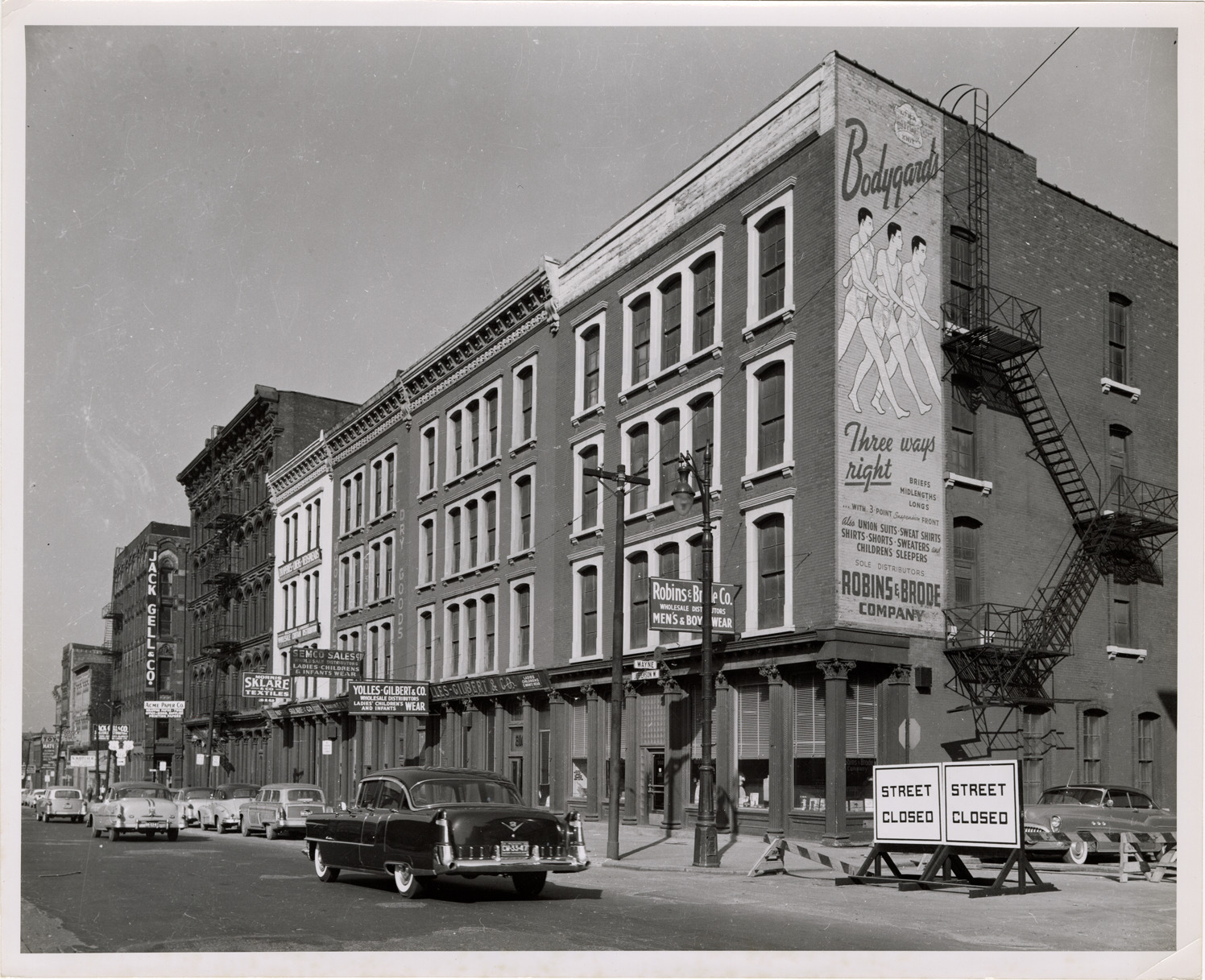 View of commercial buildings located on W. Jefferson Ave., at the corner of Wayne St. Businesses include Robins & Brode Company, Yolles, Gilbert & Co., Semco Sales, Morris Sklare & Co. textiles and Jack Gell & Co. Brick wall sign for Bodyguards clothing on right. "Street closed" signs on corner; cars in street.