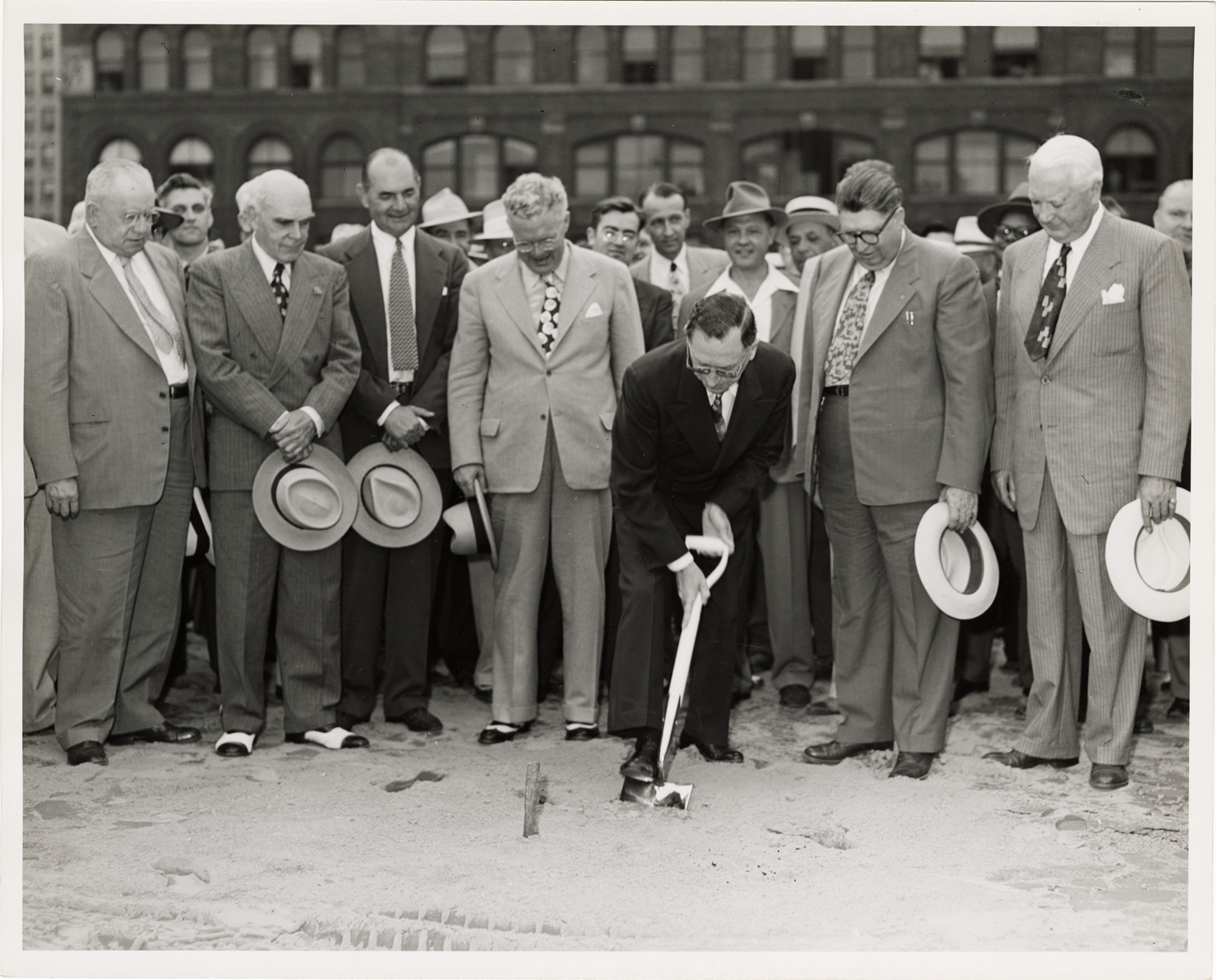 View of group of men watching an unidentified man with shovel during the groundbreaking ceremony for the City-County Building. Stamped on back: "Detroit City Plan Commission. Photograph by Harold Raymond." Handwritten on back: "City-County Bldg. site. Ground breaking ceremonies, July 11, 1951."