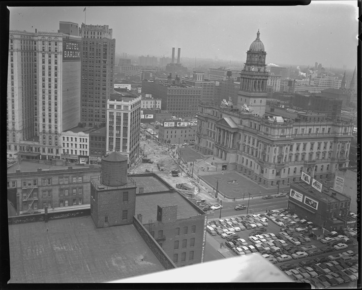 Favorite this☆ Construction to widen Randolph Street Description: Bird's-eye view of construction to widen Randolph St. Cars in parking lot in foreground; Hotel Barlum, Wayne County Building and commercial buildings in background. Details Resource ID: bh019522 Subject: Roads--Widening--Michigan--Detroit Road construction--Michigan--Detroit Hotels--Michigan--Detroit Municipal buildings--Michigan--Detroit Parking lots--Michigan--Detroit Automobiles--Michigan--Detroit Detroit Housing Commission--Archives Photography--Negatives Date Issued: 1957 Format: 1 negative ; 4 x 5 in. Member of: Burton Historical Collection Filing Location: MS/Detroit Archives. Housing Commission. Randolph widening. 57:4 Rights: Physical rights are retained by DPL. Copyright is retained in accordance with U.S. copyright laws.