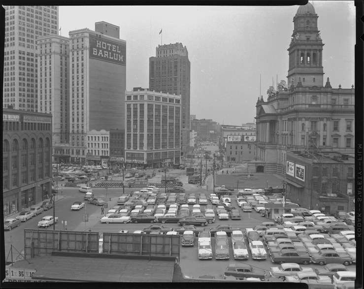 Favorite this☆ Construction to widen Randolph Street Description: View of construction to widen Randolph St. Cars in parking lot in foreground; Hotel Barlum, Wayne County Building and commercial buildings in background. Details Resource ID: bh019523 Subject: Roads--Widening--Michigan--Detroit Road construction--Michigan--Detroit Hotels--Michigan--Detroit Municipal buildings--Michigan--Detroit Parking lots--Michigan--Detroit Automobiles--Michigan--Detroit Detroit Housing Commission--Archives Photography--Negatives Date Issued: 1957 Format: 1 negative ; 4 x 5 in. Member of: Burton Historical Collection Filing Location: MS/Detroit Archives. Housing Commission. Randolph widening. 57:4 Rights: Physical rights are retained by DPL. Copyright is retained in accordance with U.S. copyright laws.