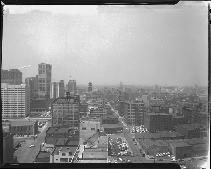Favorite this☆ Aerial view of buildings in downtown Detroit Description: Bird's-eye view of office and commercial buildings in downtown Detroit. Details Resource ID: bh019531 Subject: Commercial buildings--Michigan--Detroit Office buildings--Michigan--Detroit Detroit (Mich.)--Aerial views Detroit Housing Commission--Archives Photography--Negatives Date Issued: 1957 Format: 1 negative ; 4 x 5 in. Member of: Burton Historical Collection Filing Location: MS/Detroit Archives. Housing Commission. Central business district, general, 1957. 57:6 Rights: Physical rights are retained by DPL. Copyright is retained in accordance with U.S. copyright laws.
