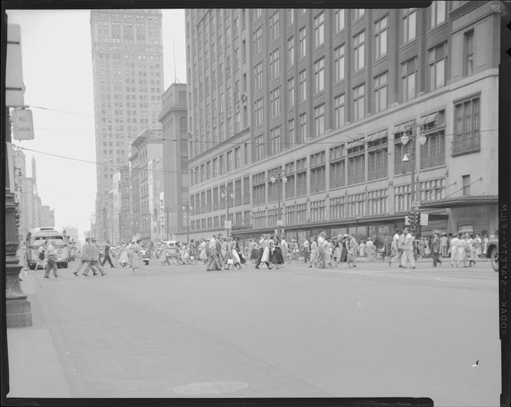 Favorite this☆ Pedestrians crossing Woodward Avenue at Gratiot Avenue Description: View of pedestrians crossing Woodward Ave. at Gratiot Ave. J.L. Hudson department store on right; commercial and office buildings in background. Details Resource ID: bh019541 Subject: Pedestrians--Michigan--Detroit Woodward Avenue (Mich.) Streets--Michigan--Detroit Commercial buildings--Michigan--Detroit Office buildings--Michigan--Detroit Department stores--Michigan--Detroit J.L. Hudson Company Detroit Housing Commission--Archives Photography--Negatives Date Issued: 1957 Format: 1 negative ; 4 x 5 in. Member of: Burton Historical Collection Filing Location: MS/Detroit Archives. Housing Commission. Central business district, general, 1957. 57:9 Rights: Physical rights are retained by DPL. Copyright is retained in accordance with U.S. copyright laws.