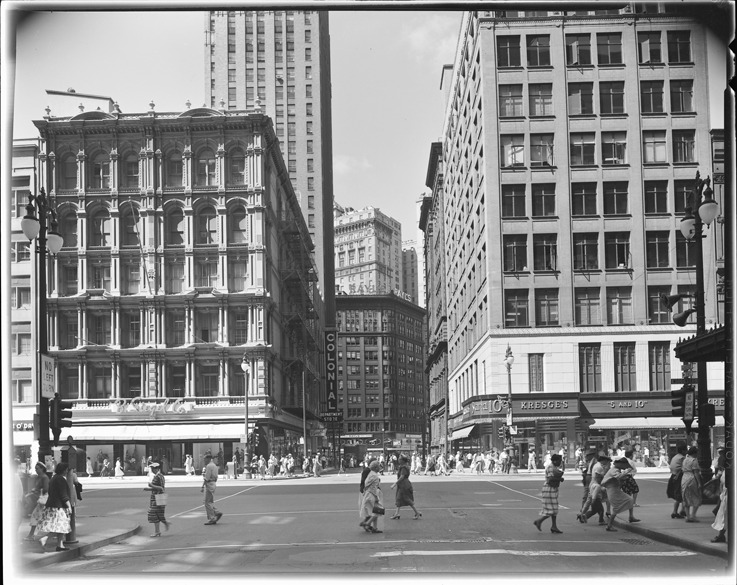 View of commercial buildings at Woodward Ave. and Gratiot Ave. Pedestrians cross street in foreground and background. Businesses include B. Siegel Co., Colonial Department Store, Rayl's and Kresge's 5 and 10.