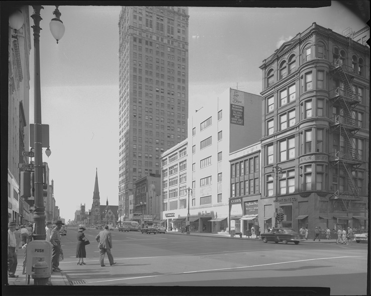 Favorite this☆ Commercial buildings on Woodward Avenue at John R Description: View of commercial buildings on Woodward Ave. near the intersection of John R. Businesses include Wright Kay & Co., Mayflower Shop, Cobb's, and Lane Bryant. Pedestrians in foreground; Central United Methodist Church in background. Details Resource ID: bh019566 Subject: Woodward Avenue (Mich.) Streets--Michigan--Detroit Commercial buildings--Michigan--Detroit Detroit Housing Commission--Archives Photography--Negatives Date Issued: 1957 Format: 1 negative ; 4 x 5 in. Member of: Burton Historical Collection Filing Location: MS/Detroit Archives. Housing Commission. Central business district, Woodward Ave., 1957. 57:10 Rights: Physical rights are retained by DPL. Copyright is retained in accordance with U.S. copyright laws.