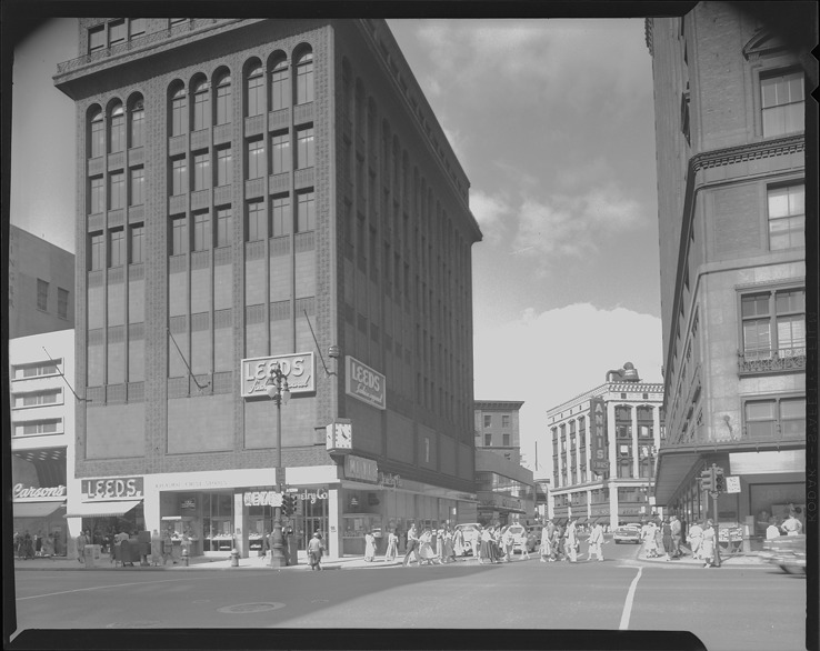 Favorite this☆ Leeds Fashion Apparel store on Woodward Avenue Description: View of Leeds Fashion Apparel store on Woodward Ave., at the corner of Grand River Avenue. Pedestrians cross street; Annis Furs in background. Details Resource ID: bh019568 Subject: Woodward Avenue (Mich.) Streets--Michigan--Detroit Clothing trade--Michigan--Detroit Commercial buildings--Michigan--Detroit Pedestrians--Michigan--Detroit Detroit Housing Commission--Archives Photography--Negatives Date Issued: 1957 Format: 1 negative ; 4 x 5 in. Member of: Burton Historical Collection Filing Location: MS/Detroit Archives. Housing Commission. Central business district, Woodward Ave., 1957. 57:10 Rights: Physical rights are retained by DPL. Copyright is retained in accordance with U.S. copyright laws.