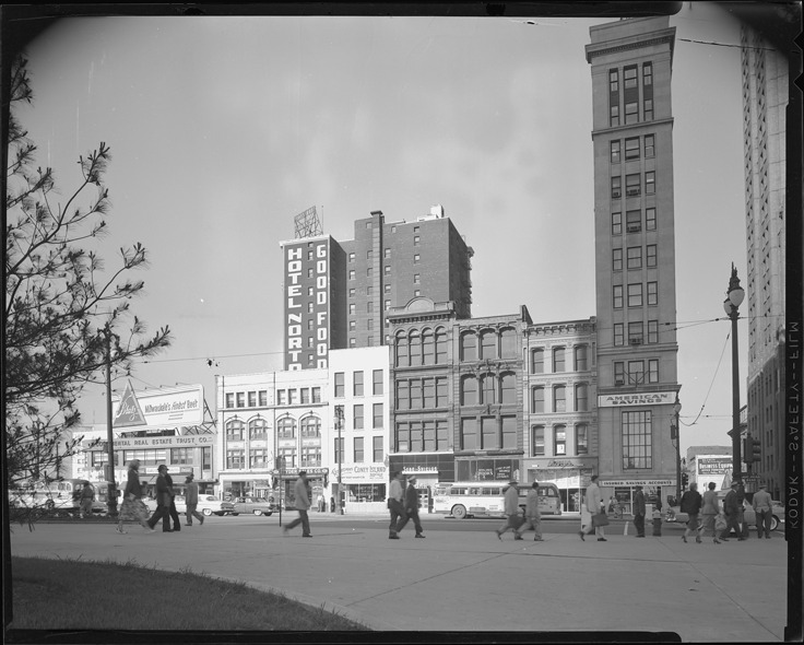 View of commercial buildings on Woodward Ave. Businesses include Continental Real Estate Trust Co., Rendezvous Coney Island, Sebe Shields and American Savings. Pedestrians on sidewalk in foreground; Hotel Norton and billboard advertising Blatz beer in background.